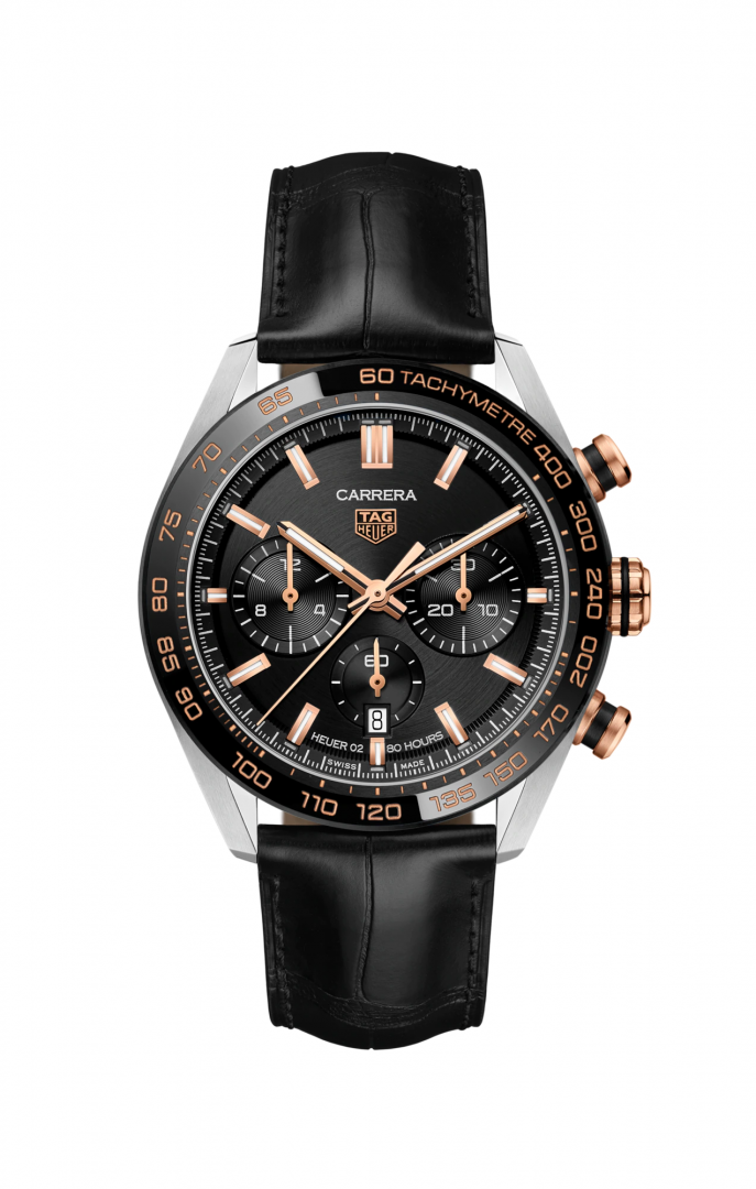 luxury watches TAG Heuer Carrera HEUER 02, Water resistance 100M, 44 mm. The watch has functions luminescence, stopwatch, Tachymeter scale and date . Basic parameters of the watch are: movement type is mechanical chronograph with automatic winding, water resistance is 100 m, dial colour is black and strap material is leather.
