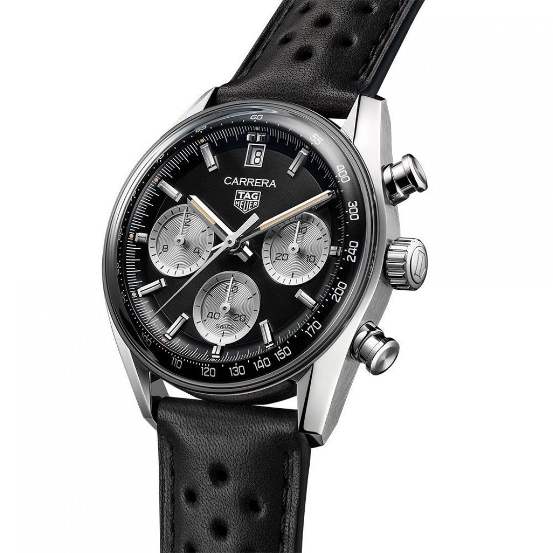 luxury watches TAG Heuer Carrera TH20-00, Water resistance 100M, 39 mm. The watch has functions luminescence, stopwatch and date . Basic parameters of the watch are: dial colour is black and silver, movement type is mechanical chronograph with automatic winding, strap material is leather and water resistance is 100 m.