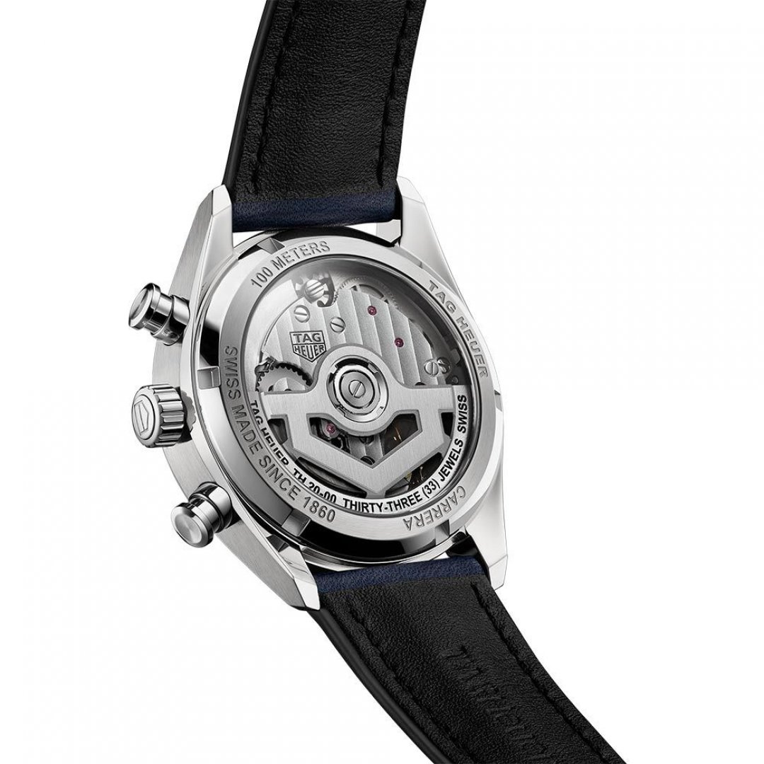 luxury watches TAG Heuer Carrera TH20-00, Water resistance 100M, 39 mm. The watch has functions luminescence, stopwatch and date . Basic parameters of the watch are: movement type is mechanical chronograph with automatic winding, strap material is leather, water resistance is 100 m and dial colour is blue.