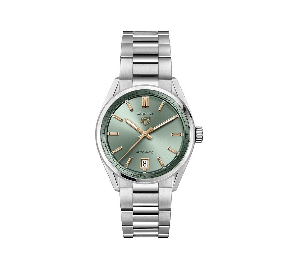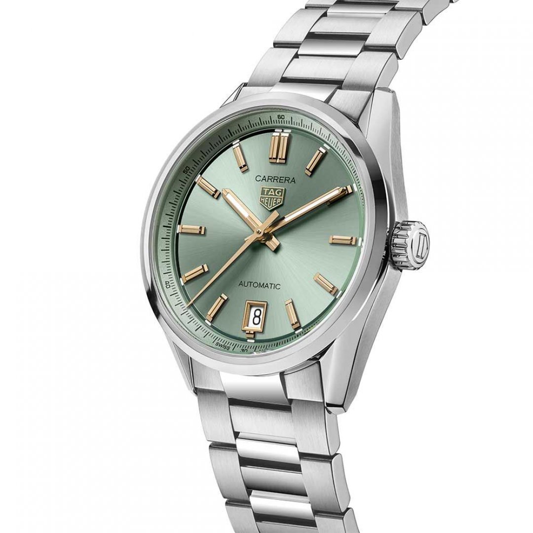 luxury watches TAG Heuer Carrera Calibre 7, Automatic, 36 mm. The watch has functions luminescence and date . Basic parameters of the watch are: movement type is mechanical watch with automatic winding, strap material is steel, water resistance is 50 m and dial colour is green.
