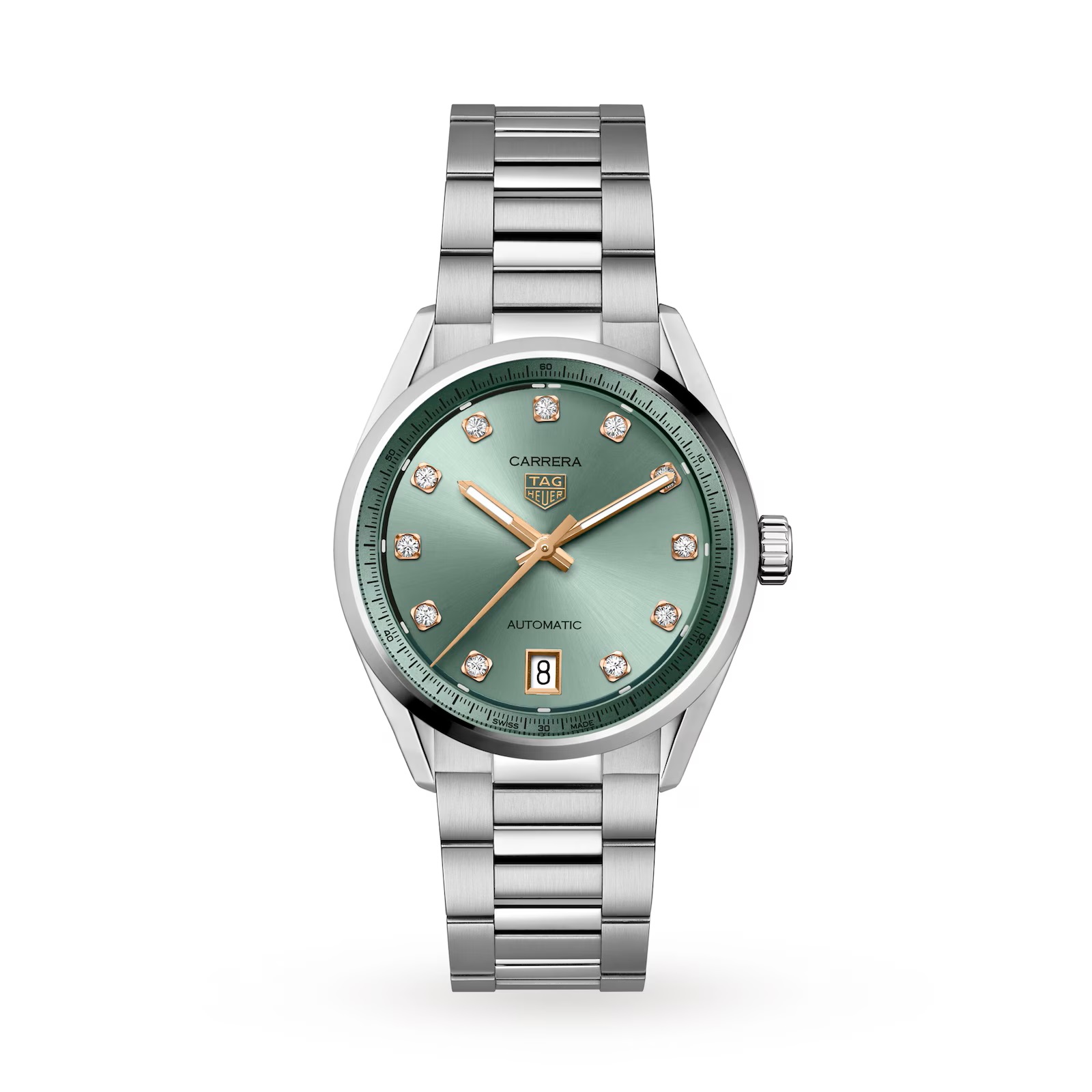 luxury watches TAG Heuer Carrera Calibre 7, Diamonds, Automatic, 36 mm. The watch has functions luminescence and date . Basic parameters of the watch are: movement type is mechanical watch with automatic winding, strap material is steel, water resistance is 50 m and dial colour is green.