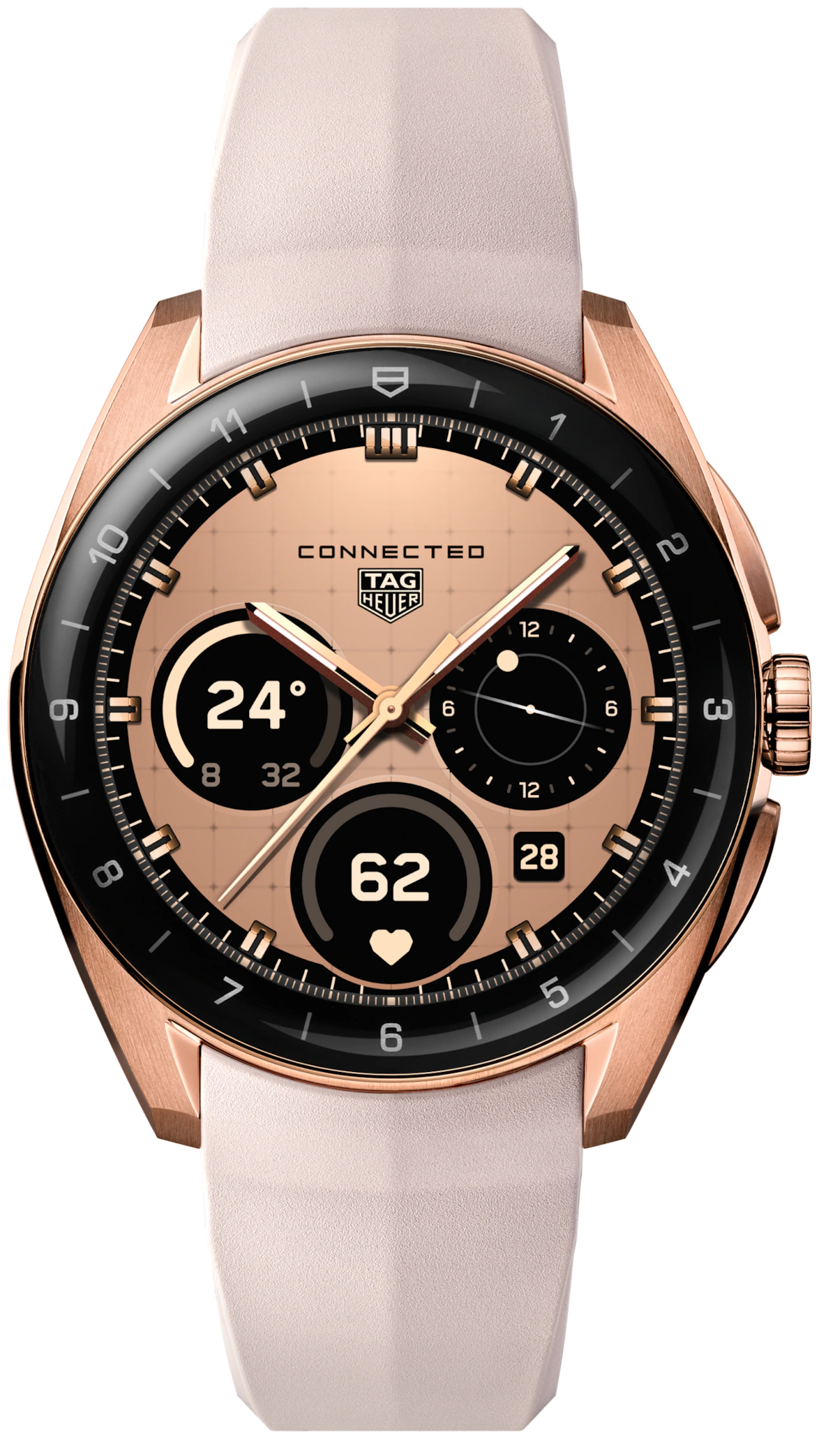 The TAG Heuer Connected Calibre E5 Golden Bright Edition SBT8011.BT0036 combines Swiss watchmaking tradition with cutting-edge digital technology. This 40 mm model features a steel case with a rose gold PVD coating, giving it a sophisticated, radiant and premium look.