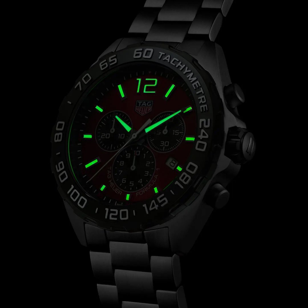 luxury watches TAG Heuer Formula 1 Quartz, Chronograph, Water resistance 200M, 43 mm. The watch has functions luminescence, stopwatch, Tachymeter scale and date . Basic parameters of the watch are: movement type is Quartz chronograph, water resistance is 200 m, strap material is steel and dial colour is red.