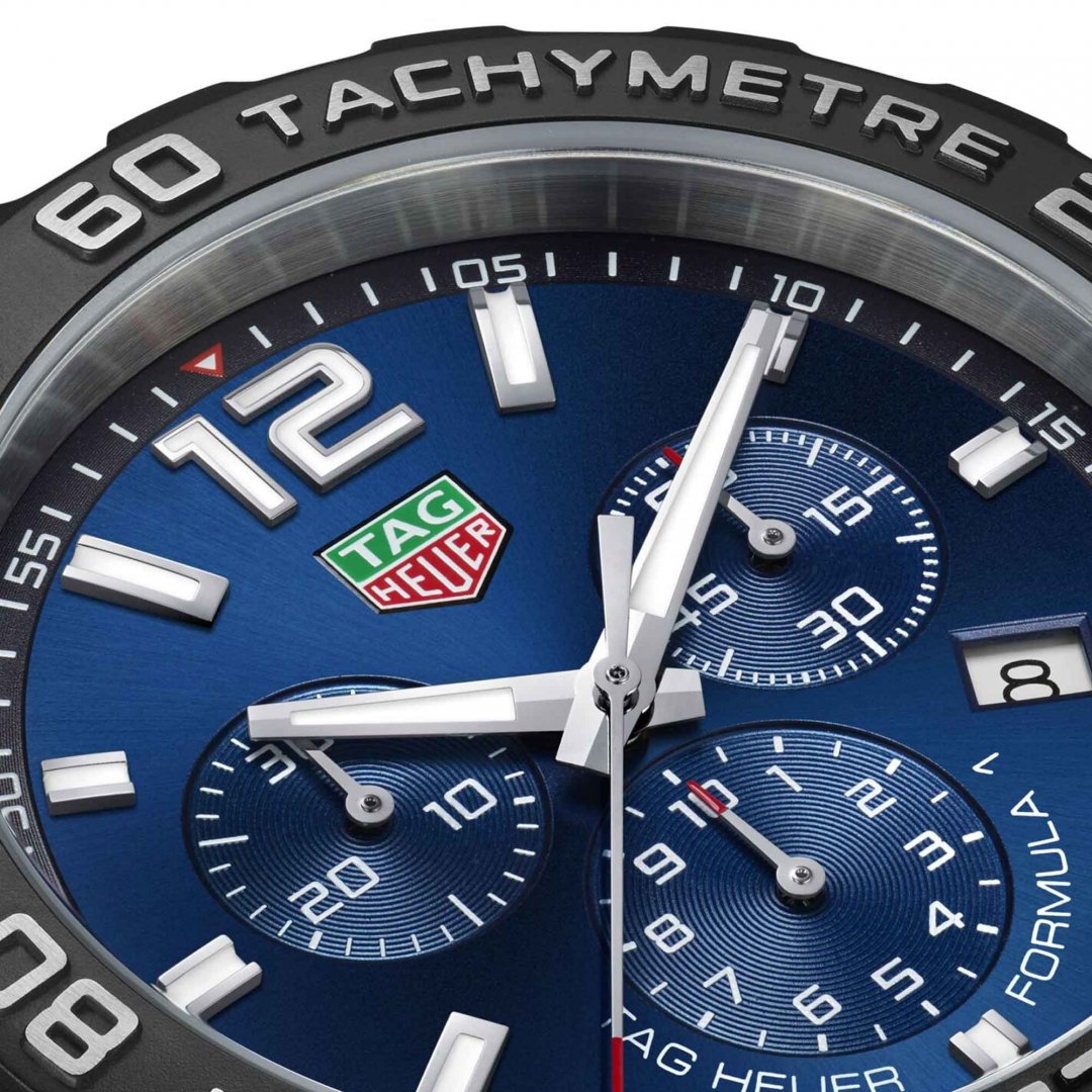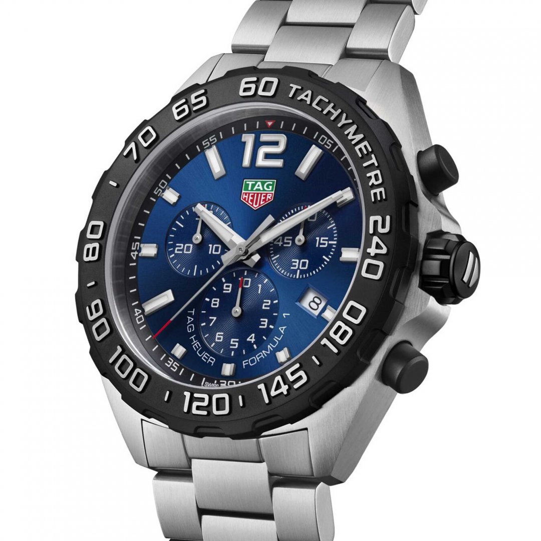 luxury watches TAG Heuer Formula 1 Quartz Chronograph, Water resistance 200M, 43 mm. The watch has functions luminescence, stopwatch, Tachymeter scale and date . Basic parameters of the watch are: movement type is Quartz chronograph, water resistance is 200 m, strap material is steel and dial colour is blue.