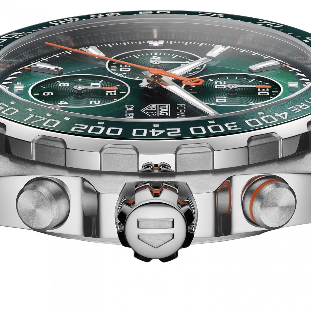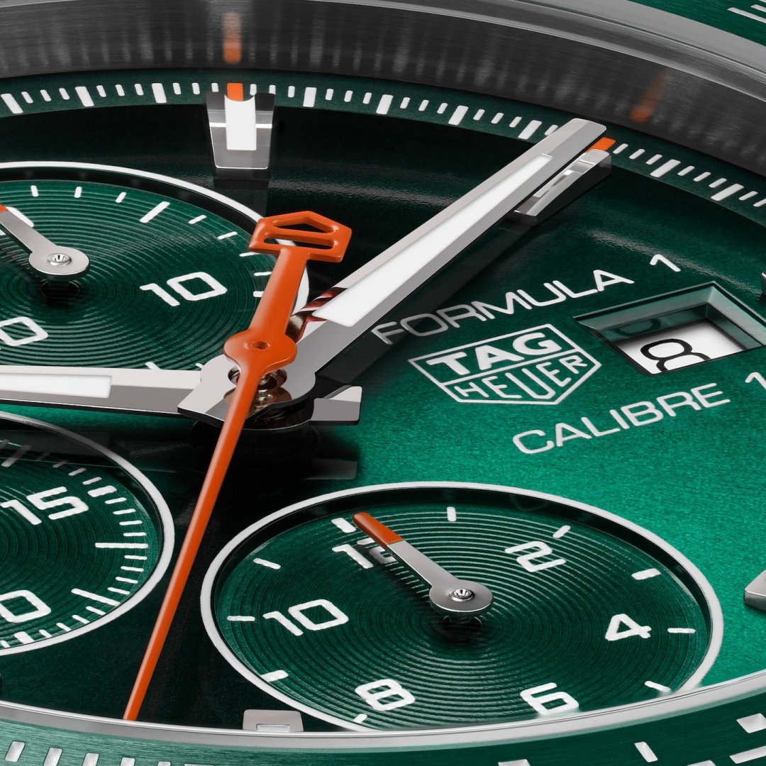 luxury watches TAG Heuer Formula 1 Calibre 16, Automatic Chronograph, 44 mm. The watch has functions stopwatch, Tachymeter scale and date . Basic parameters of the watch are: movement type is mechanical chronograph with automatic winding, water resistance is 200 m, strap material is steel and dial colour is green.
