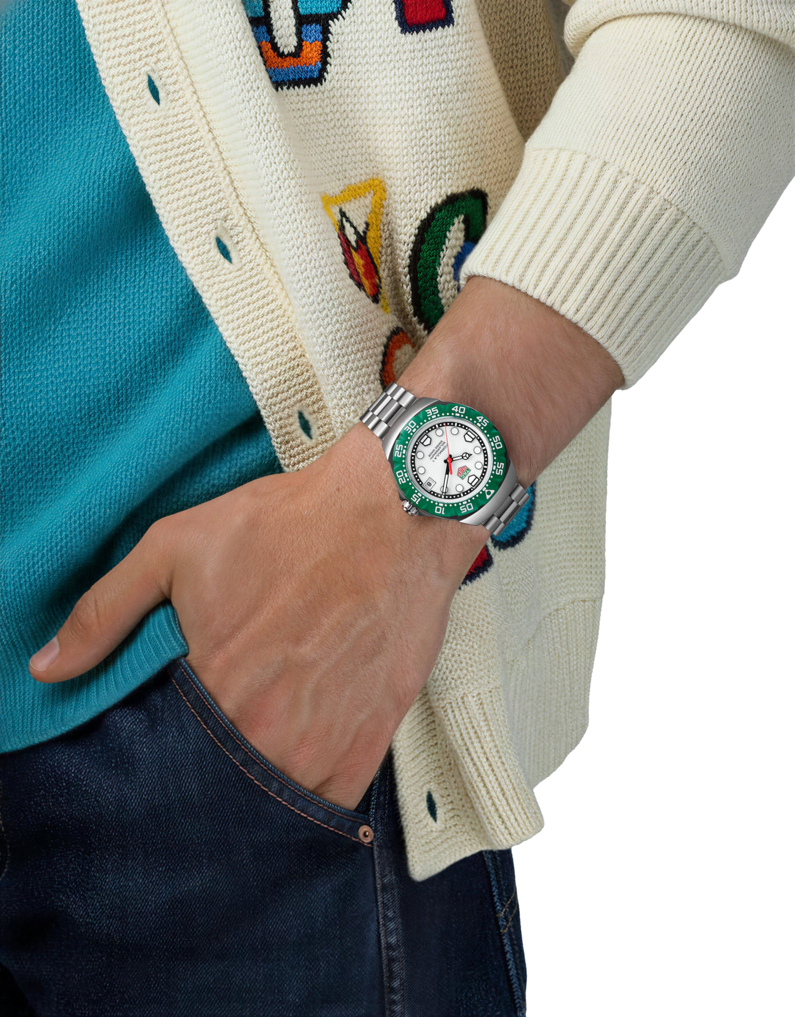 The white opaline dial with red, green, and black accents references racing timers and the DNA of the TAG Heuer brand. This is a watch that is as dynamic as the world of Formula 1.