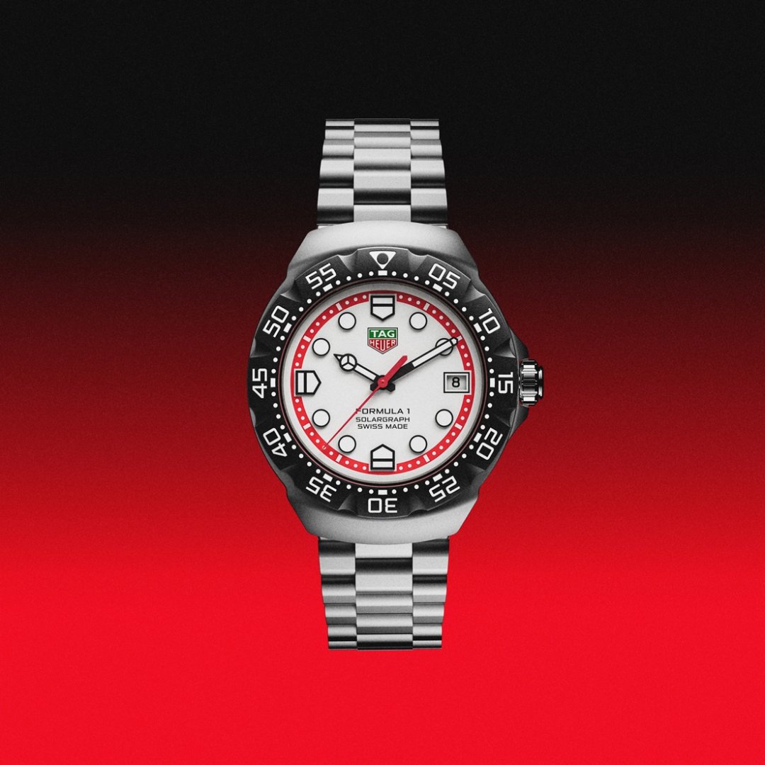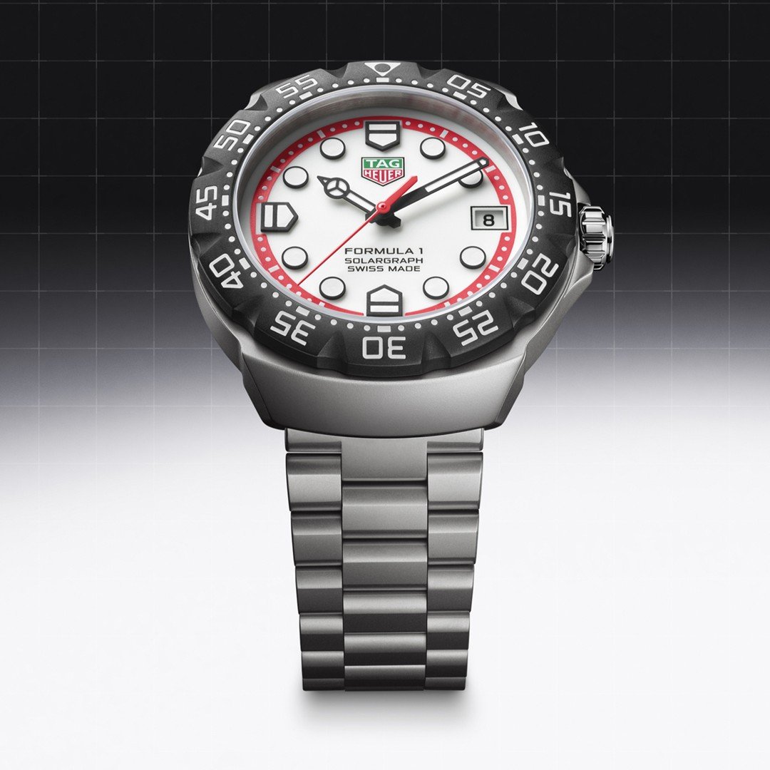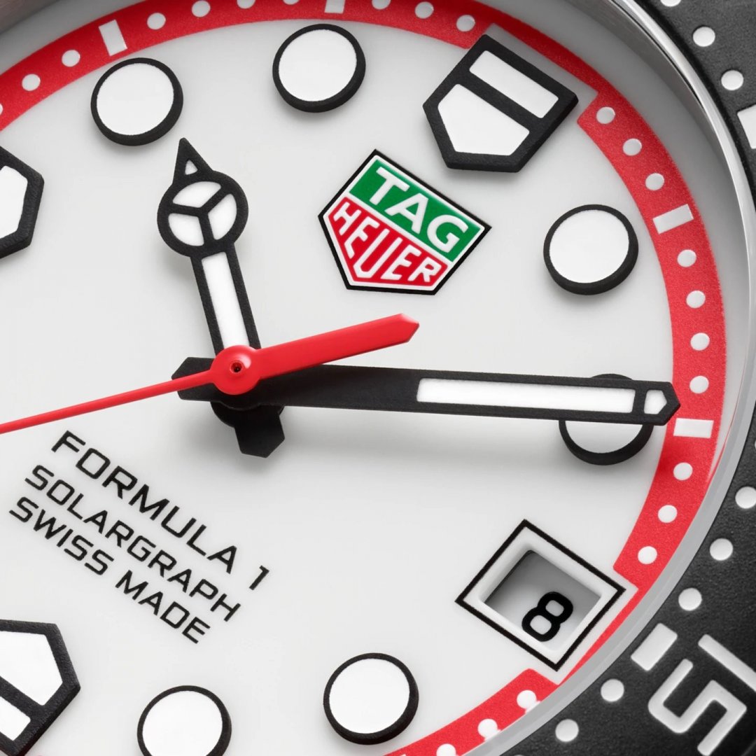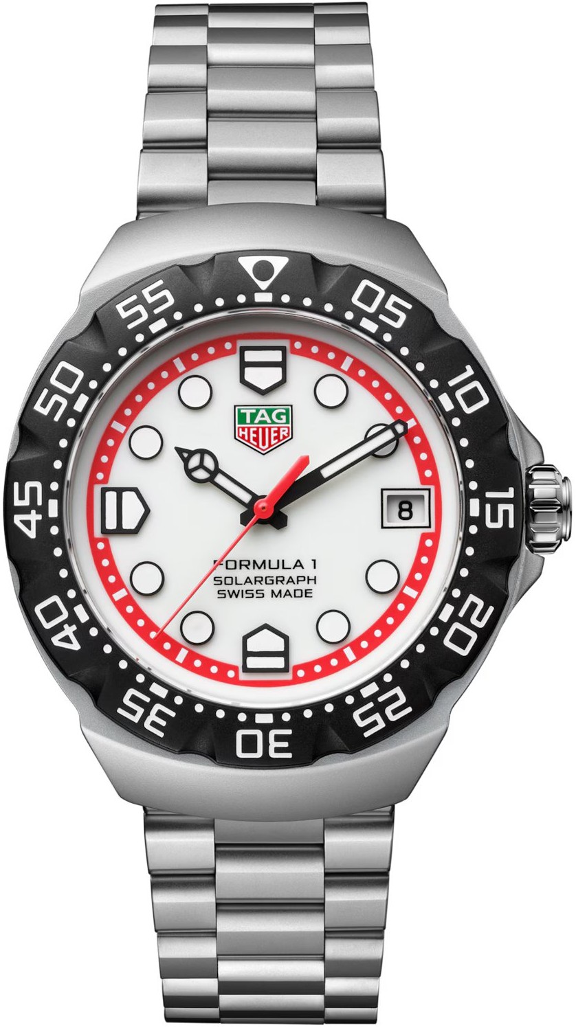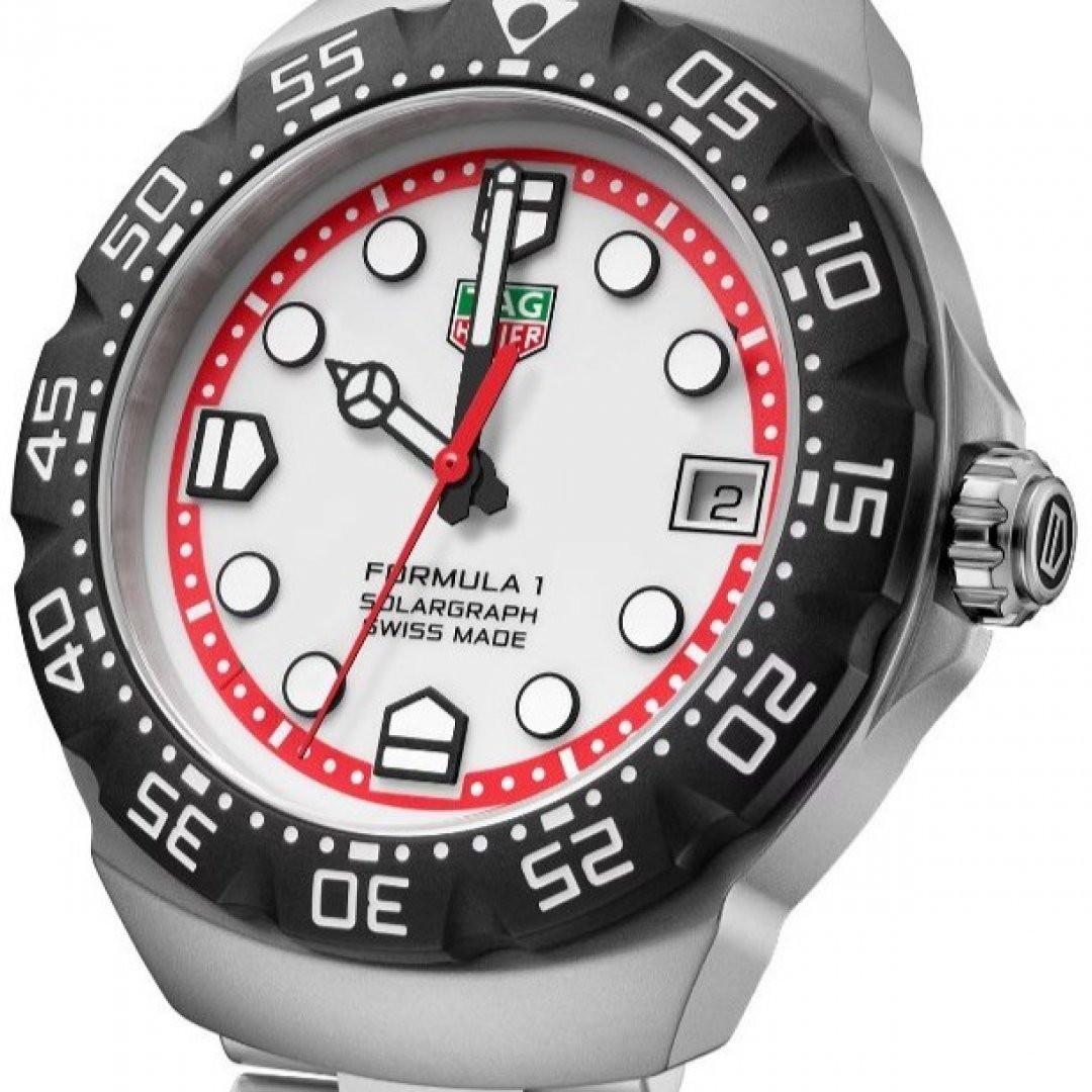 luxury watches TAG Heuer Formula 1 Solargraph Water resistance 100M, Quartz, 38 mm. The watch has functions luminescence and date . Basic parameters of the watch are: movement type is Quartz watches, strap material is steel, dial colour is white and red and water resistance is 100 m.