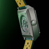 The TAG Heuer Monaco Chronograph Racing Green is a limited edition, with "ONE OF 1000" inscribed on the case back. It comes in a uniquely designed black box and travel pouch with bright yellow stripes and decorative stitching.