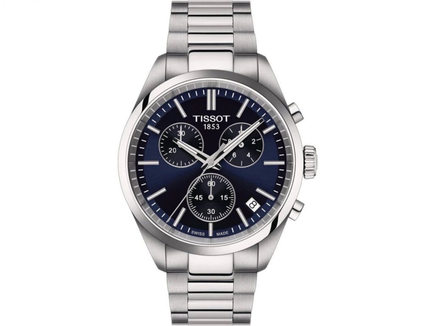 luxury watches Tissot PR100 Quartz Chronograph, Water resistance 100M, 40 mm. The watch has functions luminescence, stopwatch and date . Basic parameters of the watch are: movement type is Quartz chronograph, water resistance is 100 m, strap material is steel and dial colour is blue.