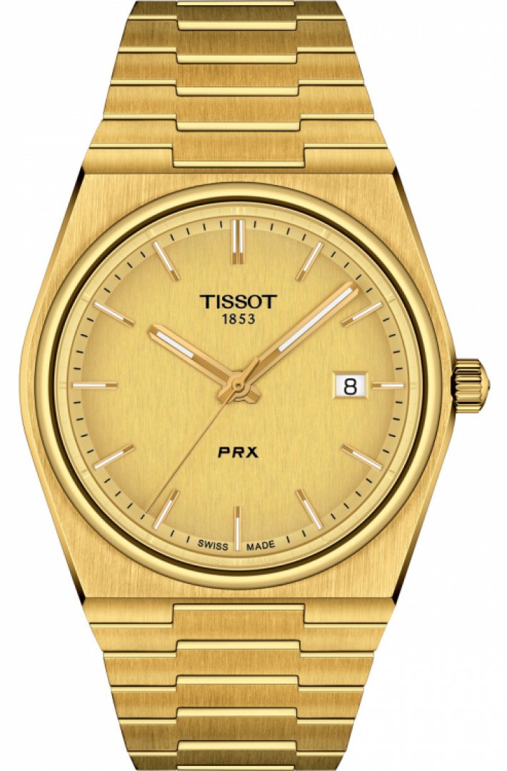 luxury watches Tissot PRX Quartz, Water resistance 100M, 40 mm. The watch has functions date . Basic parameters of the watch are: movement type is Quartz watches, water resistance is 100 m, strap material is steel and dial colour is golden.