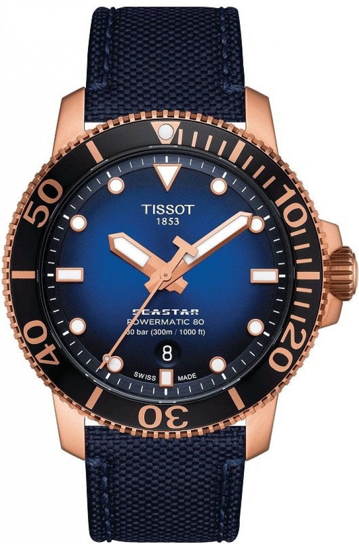 luxury watches Tissot Seastar 1000 PROFESSIONAL Powermatic 80, Water resistance 300M, 43mm. The watch has functions luminescence and date . Basic parameters of the watch are: movement type is mechanical watch with automatic winding, water resistance is 300 m, dial colour is blue and strap material is textiles.