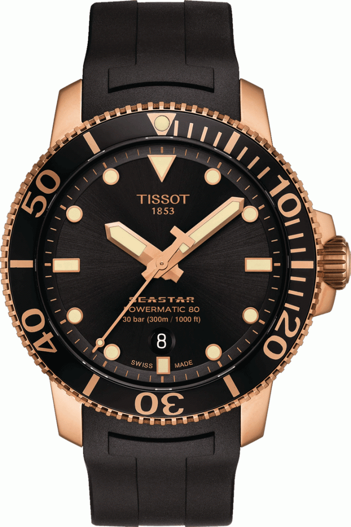 luxury watches Tissot Seastar 1000 PROFESSIONAL Automat, Water resistance 300M, 43 mm. The watch has functions luminescence and date . Basic parameters of the watch are: movement type is mechanical watch with automatic winding, strap material is rubber, water resistance is 300 m and dial colour is black.