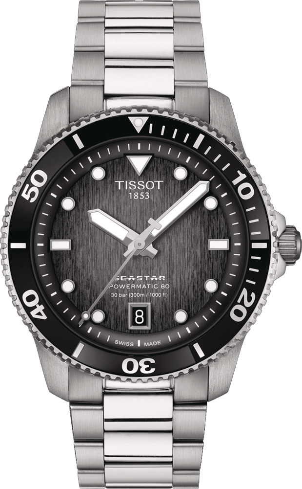 luxury watches Tissot Seastar 1000 PROFESSIONAL Powermatic 80, Water resistance 300M, 40 mm. The watch has functions luminescence and date . Basic parameters of the watch are: movement type is mechanical watch with automatic winding, water resistance is 300 m, dial colour is black and strap material is steel.