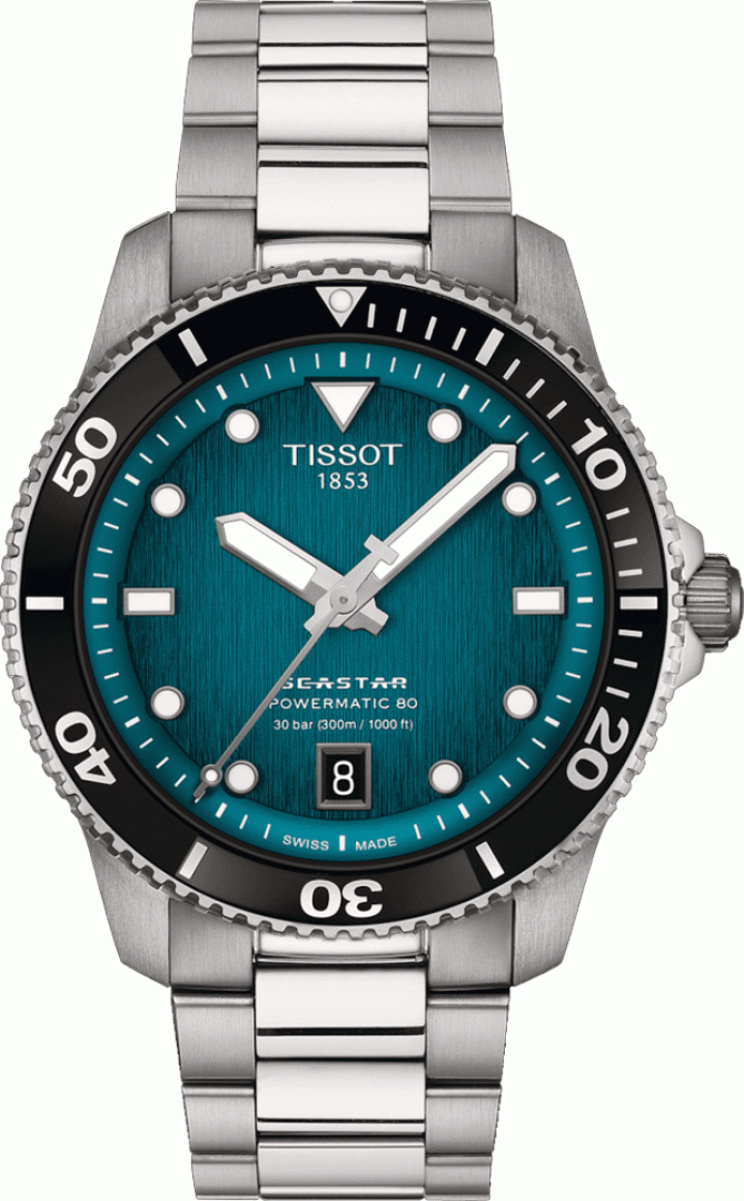 luxury watches Tissot Seastar 1000 PROFESSIONAL Powermatic 80, Water resistance 300M, 40 mm. The watch has functions luminescence and date . Basic parameters of the watch are: movement type is mechanical watch with automatic winding, water resistance is 300 m, strap material is steel and dial colour is blue.