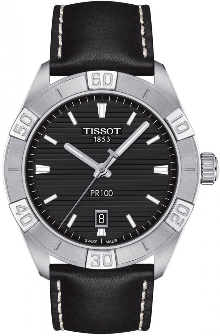 luxury watches Tissot T-Classic PR 100 Quartz, Water resistance 100M, 42 mm. The watch has functions luminescence, date and E.O.L.. Basic parameters of the watch are: movement type is Quartz watches, water resistance is 100 m, strap material is leather and dial colour is black.