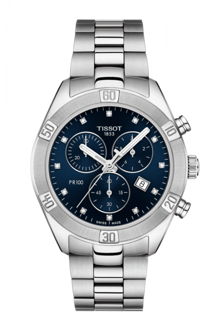 Luxury watches Tissot T-Classic PR 100 . The watch has functions luminescence, stopwatch, date and E.O.L.. Basic parameters of the watch are: movement type is Quartz chronograph, strap material is steel, water resistent is 100 m and dial colour is blue.