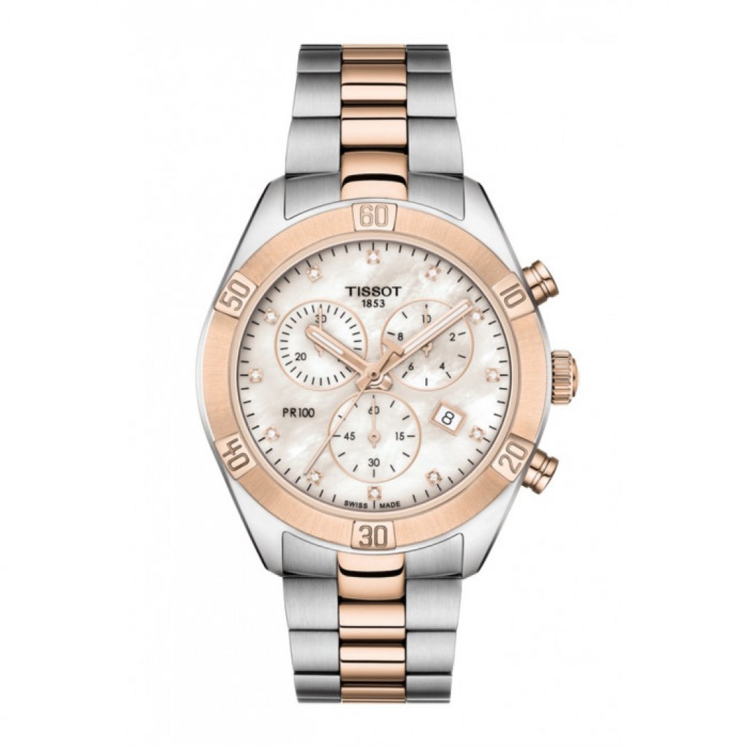 Luxury watches Tissot T-Classic PR 100 . The watch has functions luminescence, stopwatch, date and E.O.L.. Basic parameters of the watch are: dial colour is pearl, movement type is Quartz chronograph, strap material is steel and water resistent is 100 m.