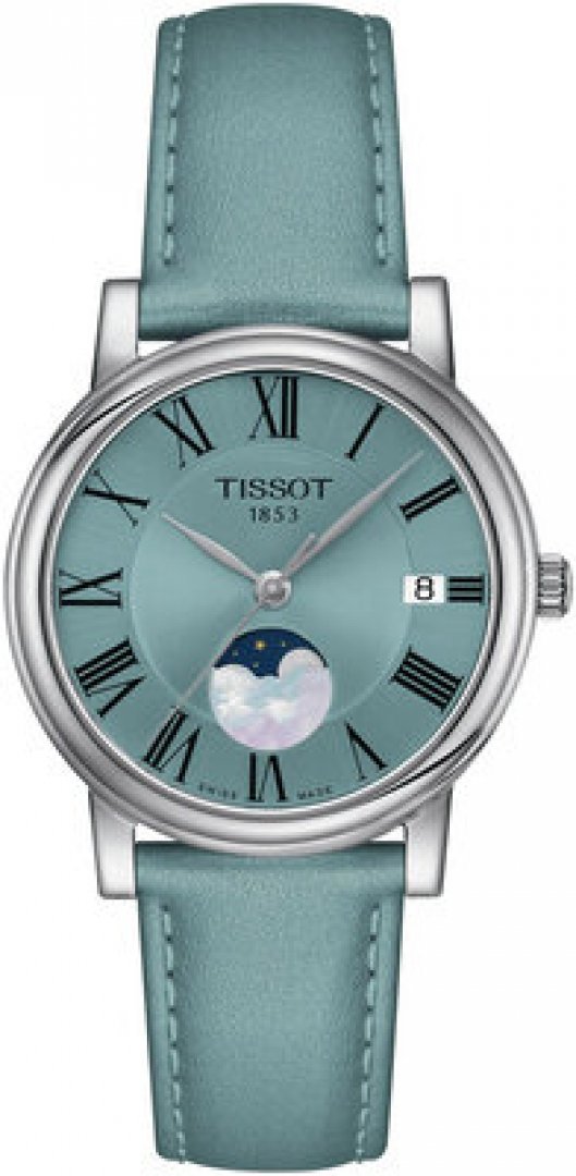 luxury watches Tissot T-Classic Carson Premium Lady Moonphase Quartz, Moonphase, 32 mm. The watch has functions luminescence, moon phases and date . Basic parameters of the watch are: dial colour is blue, movement type is Quartz watches, strap material is leather and water resistance is 30 m.