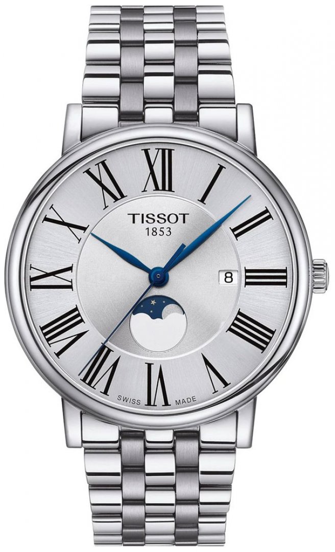 luxury watches Tissot T-Classic Carson Premium Gent Moonphase Quartz, Moonphase, 40 mm. The watch has functions luminescence, moon phases and date . Basic parameters of the watch are: movement type is Quartz watches, water resistance is 30 m, dial colour is silver and strap material is steel.
