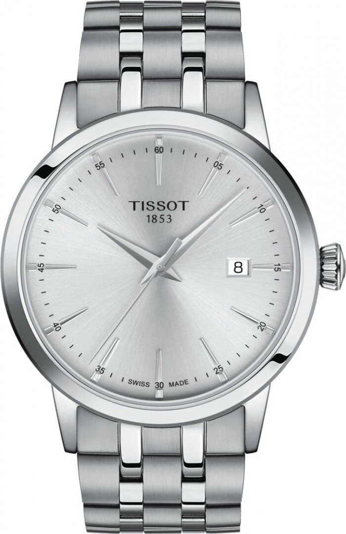 luxury watches Tissot T-Classic CLASSIC DREAM Quartz, 42 mm. The watch has functions date and E.O.L.. Basic parameters of the watch are: movement type is Quartz watches, water resistance is 50 m, dial colour is silver and strap material is steel.