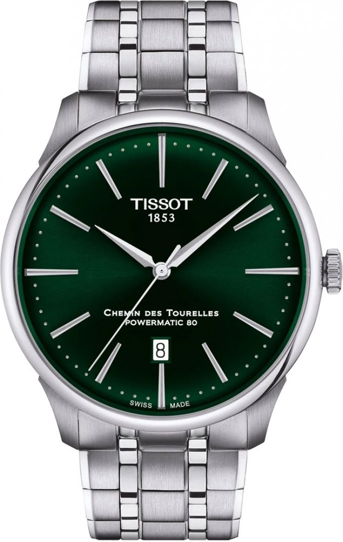 luxury watches Tissot T-Classic Chemin des Tourelles Powermatic 80, 42 mm. The watch has functions date . Basic parameters of the watch are: movement type is mechanical watch with automatic winding, strap material is steel, water resistance is 50 m and dial colour is green.