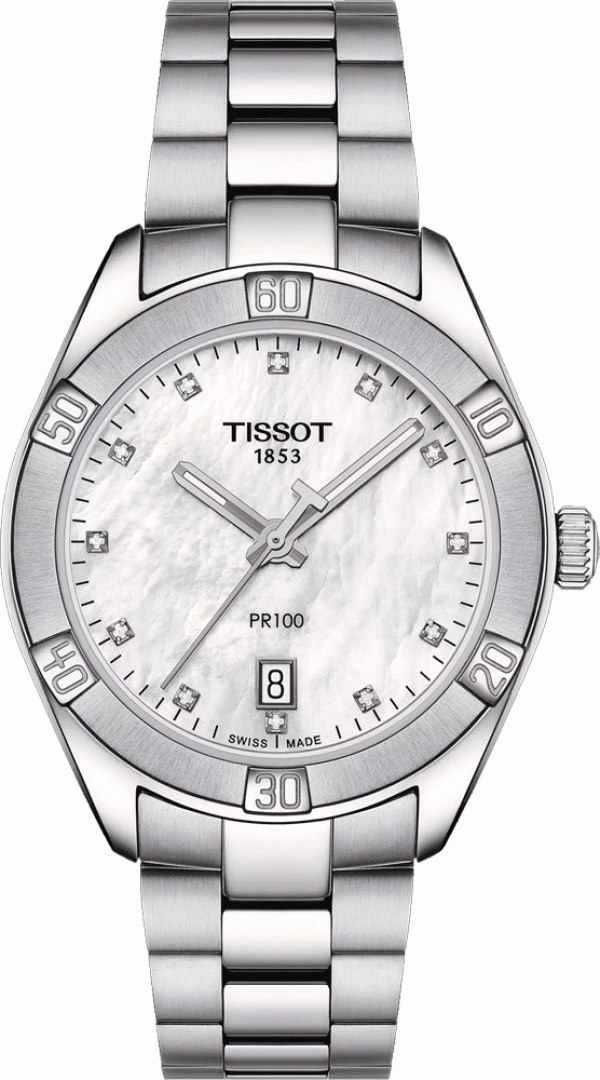 luxury watches Tissot T-Sport PR 100 Sport Chic, Diamonds, 36 mm. The watch has functions luminescence, date and E.O.L.. Basic parameters of the watch are: movement type is Quartz watches, strap material is steel, water resistance is 100 m and dial colour is pearl.