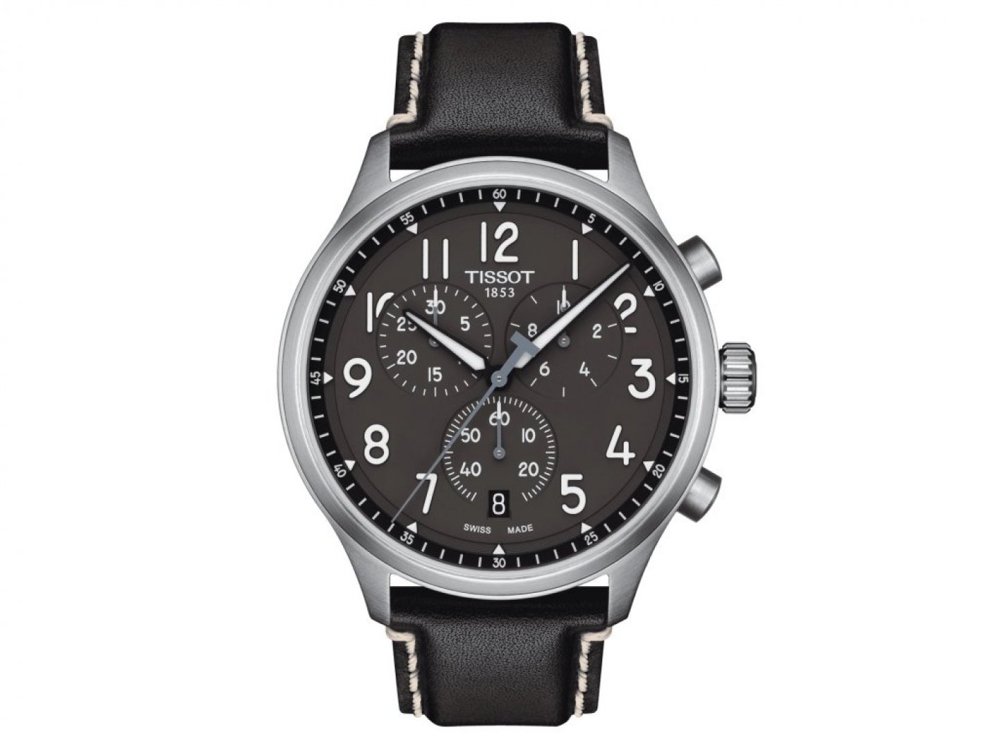 luxury watches Tissot T-Sport CHRONO XL, Water resistance 100M, 45 mm. The watch has functions luminescence, stopwatch and date . Basic parameters of the watch are: movement type is Quartz chronograph, water resistance is 100 m, dial colour is black and strap material is leather.