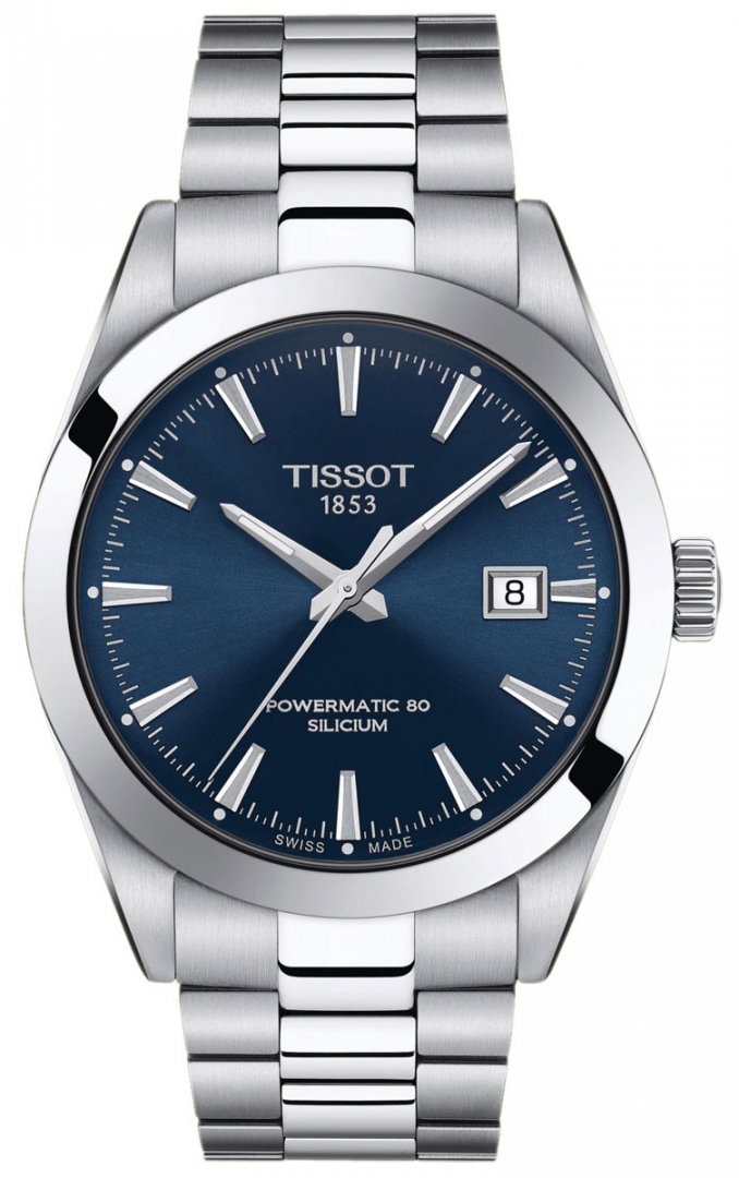 luxury watches Tissot T-Sport GENTLEMAN SILICIUM Powermatic 80, Water resist 100M, 40 mm. The watch has functions luminescence and date . Basic parameters of the watch are: movement type is mechanical watch with automatic winding, strap material is steel, water resistance is 100 m and dial colour is blue.