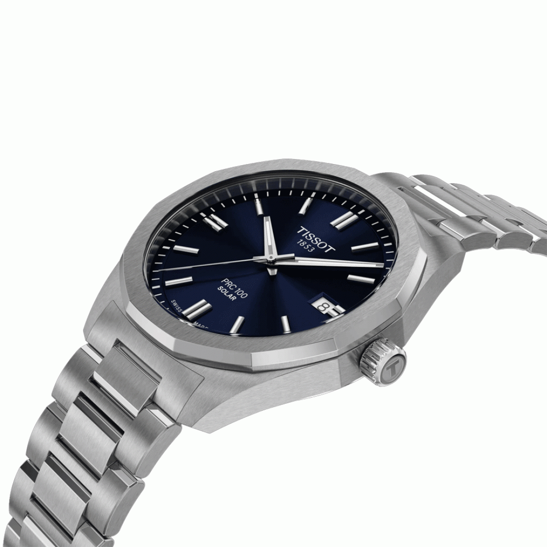 luxury watches Tissot PRC 100 SOLAR Quartz, Water resistance 100M, 39 mm. The watch has functions luminescence and date . Basic parameters of the watch are: water resistance is 100 m, strap material is steel, movement type is Quartz watches and dial colour is blue.