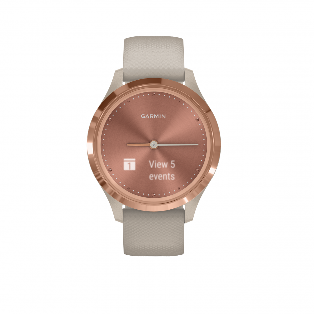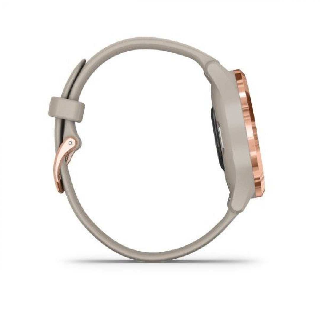 Smart hodinky športové hodinky Garmin Vivomove 3S Light Sand/Rose Gold 39 mm, Dotykový displej, Vode odolnosť 50M. Hodinky disponujú funkciami alarm, barometer, kalendár, stopky, tréningové funkcie, ukazovateľ dátumu, večný kalendár, výškomer, multifunkčné, Akcelerometer, Bluetooth® a Dotyková obrazovka. Základné parametre hodín sú: typ strojčeka je špeciálne, vode odolnosť je 50 m a materiál remienka je silikon.