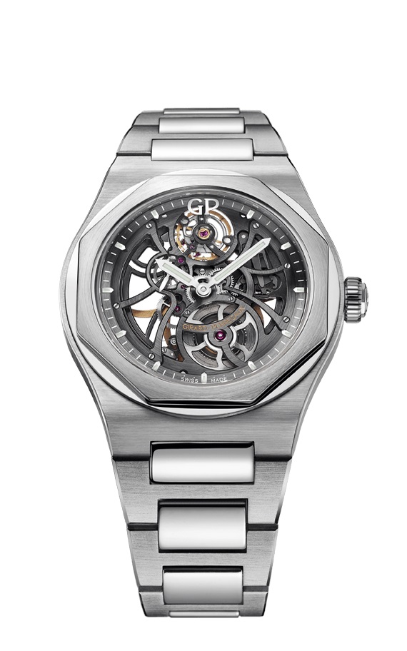 luxusné hodinky Girard-Perregaux Laureato SKELETON Manufaktúrny kaliber, Automat, 42 mm. Hodinky disponujú funkciami luminiscencia. Základné parametre hodín sú: typ strojčeka je mechanické hodinky s automatickým náťahom, materiál remienka je oceľ, vode odolnosť je 100 m a farba ciferníka je priehľadná.