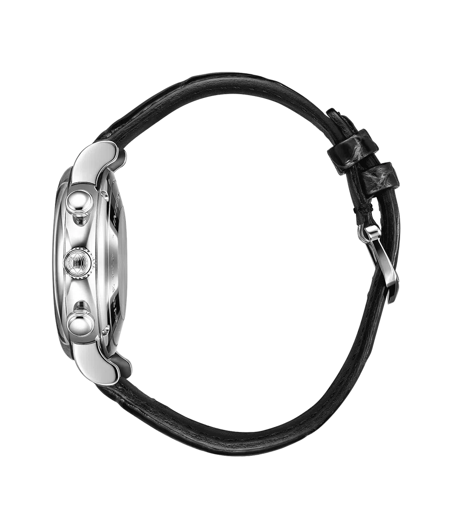 Strieborný ciferník s kontrastnými subciferníkmi a zlatými detailmi dodáva hodinkám noblesu, zatiaľ čo robustné oceľové puzdro a kvalitný kožený remienok zabezpečujú komfort a odolnosť.