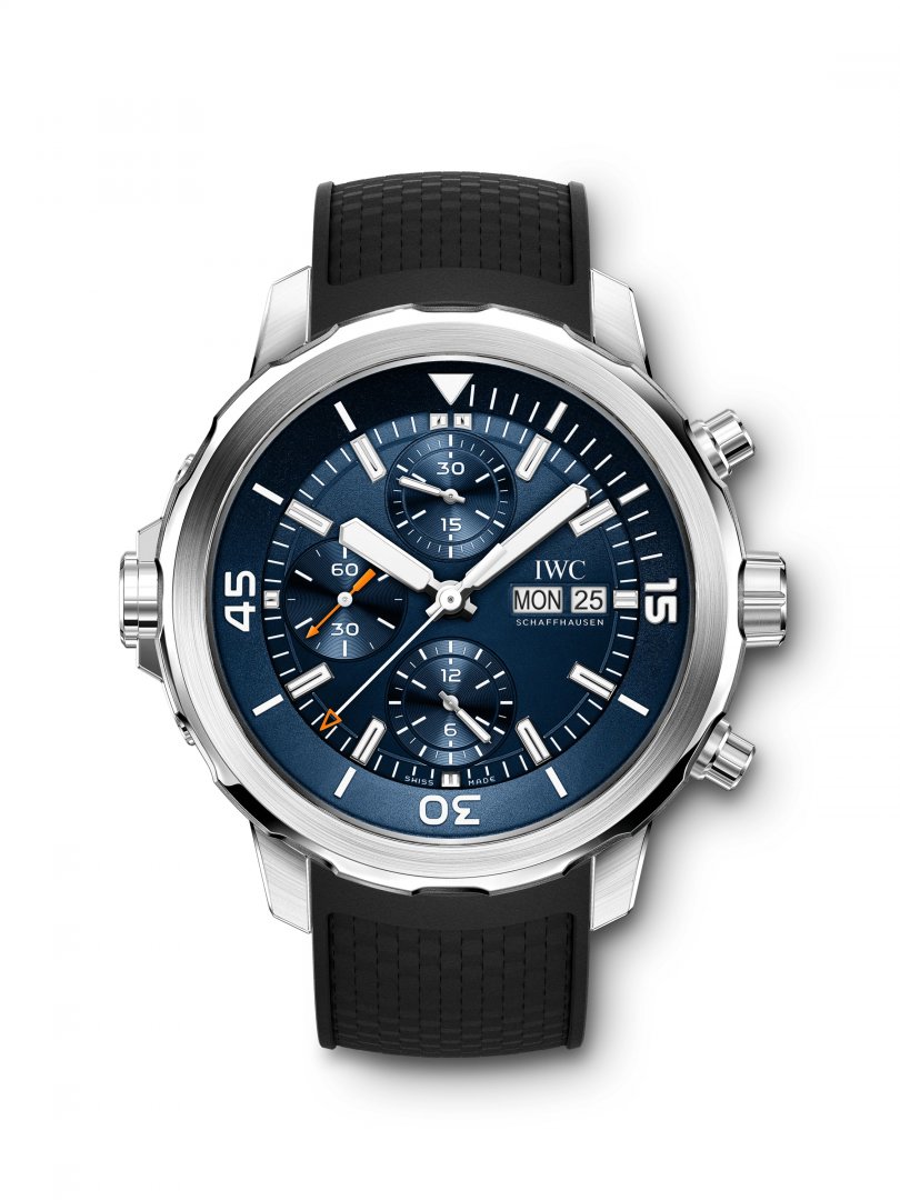Luxusné hodinky IWC Aquatimer CHRONOGRAPH EDITION “EXPEDITION JACQUES-YVES COUSTEAU” Automat Chronograf, 44 mm. Hodinky disponujú funkciami luminiscencia, ukazovateľ dátumu, stopky, Day-Date a heliový ventil. Základné parametre hodín sú: farba ciferníka je modrá, materiál remienka je kaučuk, vode odolnosť je 300 m a typ strojčeka je mechanický chronograf s automatickým náťahom.