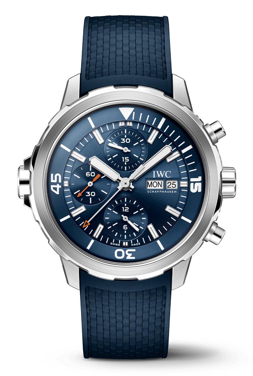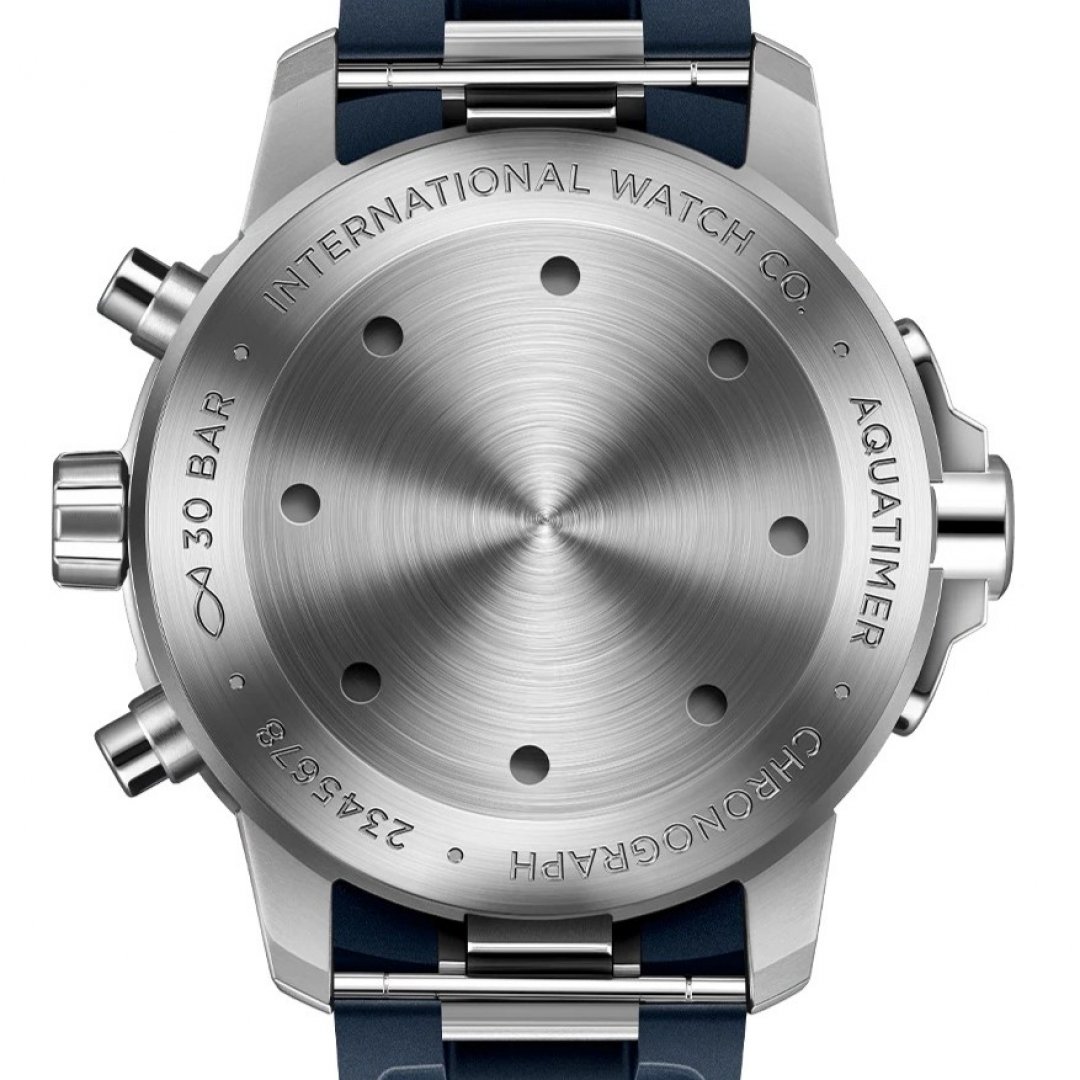 luxusné hodinky IWC Schaffhausen Aquatimer Chronograph Vode odolnosť 300M, 44 mm. Hodinky disponujú funkciami luminiscencia, ukazovateľ dátumu, stopky, Day-Date a heliový ventil. Základné parametre hodín sú: vode odolnosť je 300 m, typ strojčeka je mechanický chronograf s automatickým náťahom, materiál remienka je kaučuk a farba ciferníka je modrá.