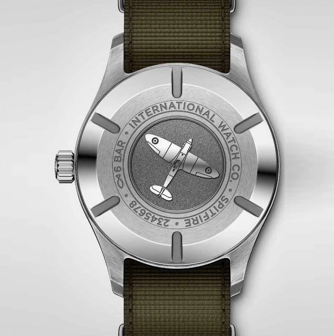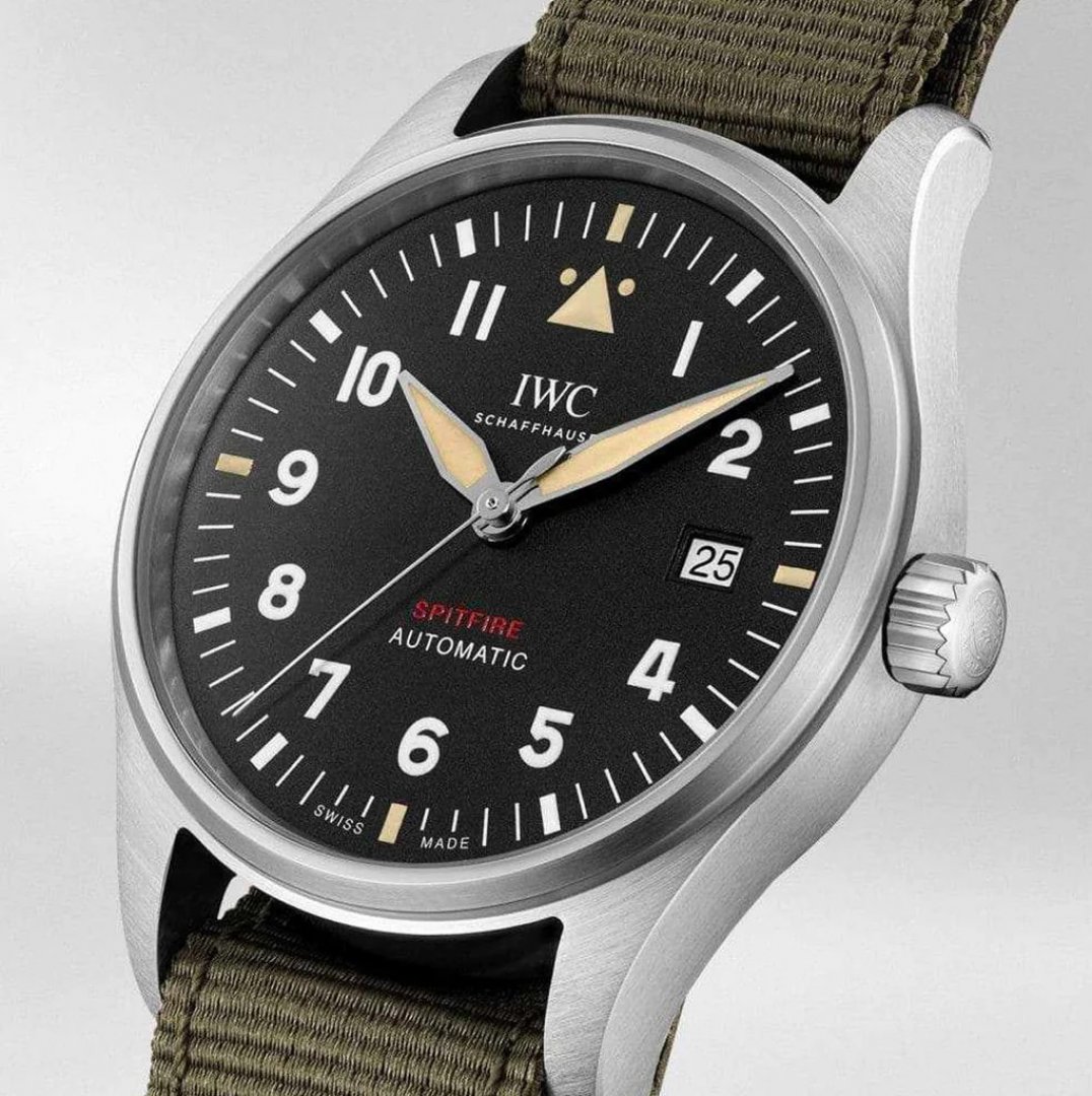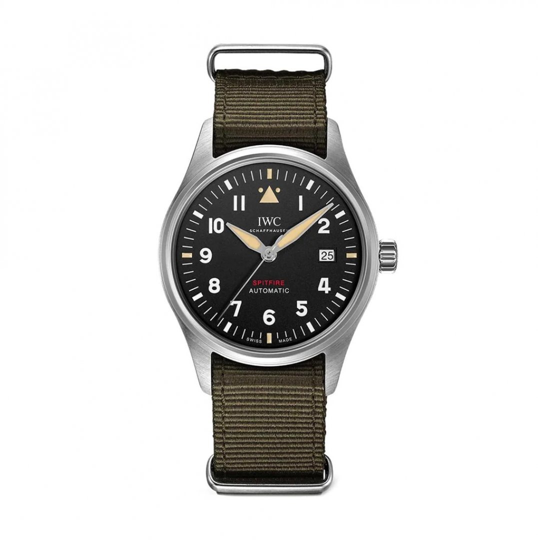 luxusné hodinky IWC Schaffhausen Pilot´s Watches Spitfire Automat, 39 mm. Hodinky disponujú funkciami luminiscencia a ukazovateľ dátumu. Základné parametre hodín sú: farba ciferníka je čierna, typ strojčeka je mechanické hodinky s automatickým náťahom, materiál remienka je textil a vode odolnosť je 60 m.