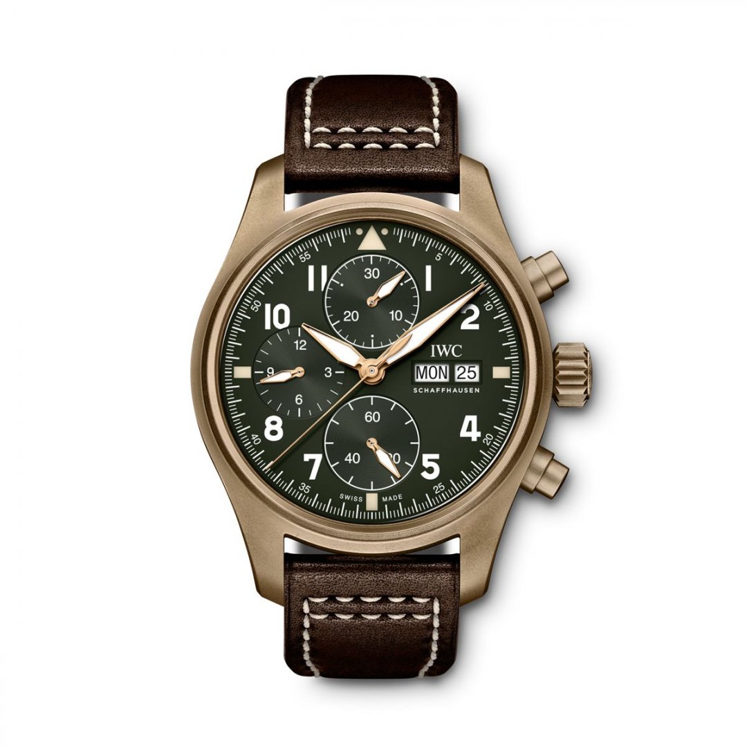 Luxusné hodinky IWC Pilot´s Watches CHRONOGRAPH SPITFIRE Bronzové puzdro, 41 mm. Hodinky disponujú funkciami luminiscencia, stopky, ukazovateľ dátumu a Day-Date. Základné parametre hodín sú: typ strojčeka je mechanický chronograf s automatickým náťahom, materiál remienka je koža, vode odolnosť je 60 m a farba ciferníka je zelená.