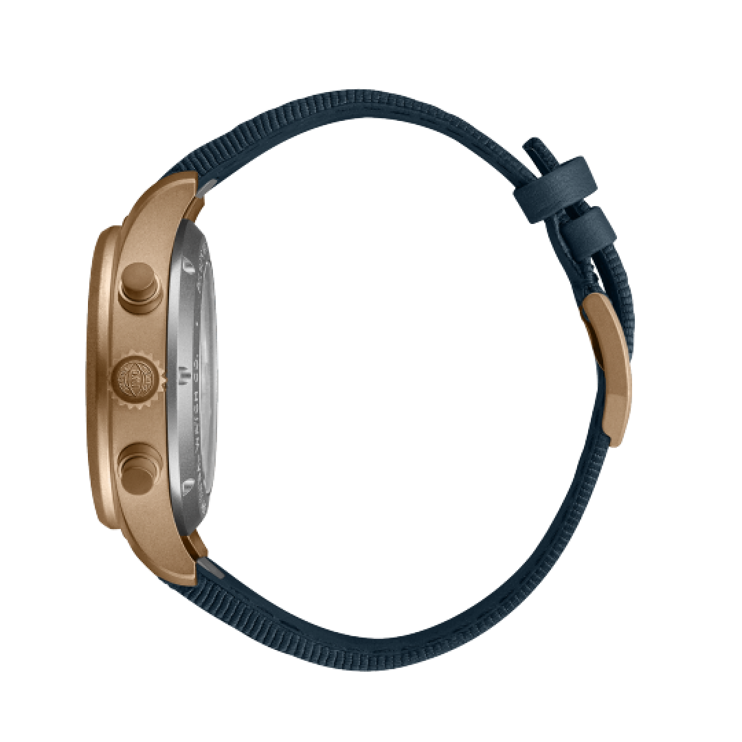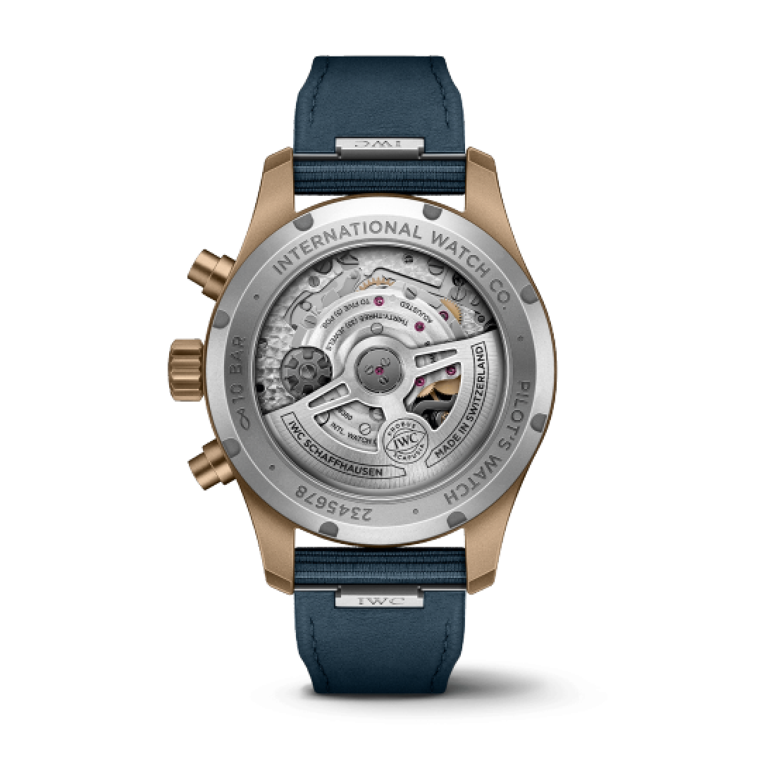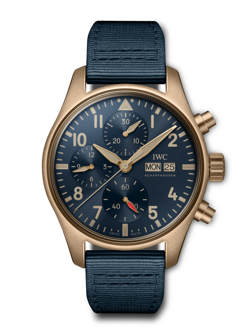 luxusné hodinky IWC Schaffhausen Pilot´s Watches CHRONOGRAPH 41 Manufaktúrny kaliber, Bronz, 41 mm. Hodinky disponujú funkciami luminiscencia, stopky a ukazovateľ dátumu. Základné parametre hodín sú: farba ciferníka je modrá, typ strojčeka je mechanický chronograf s automatickým náťahom, vode odolnosť je 100 m a materiál remienka je nylon.