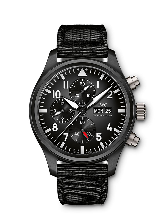 Luxusné hodinky IWC Pilot´s Watches TOP GUN, Automat Chronograf, 44.5 mm. Hodinky disponujú funkciami luminiscencia, stopky, ukazovateľ dátumu a Day-Date. Základné parametre hodín sú: farba ciferníka je čierna, typ strojčeka je mechanický chronograf s automatickým náťahom, materiál remienka je textil a vode odolnosť je 60 m.