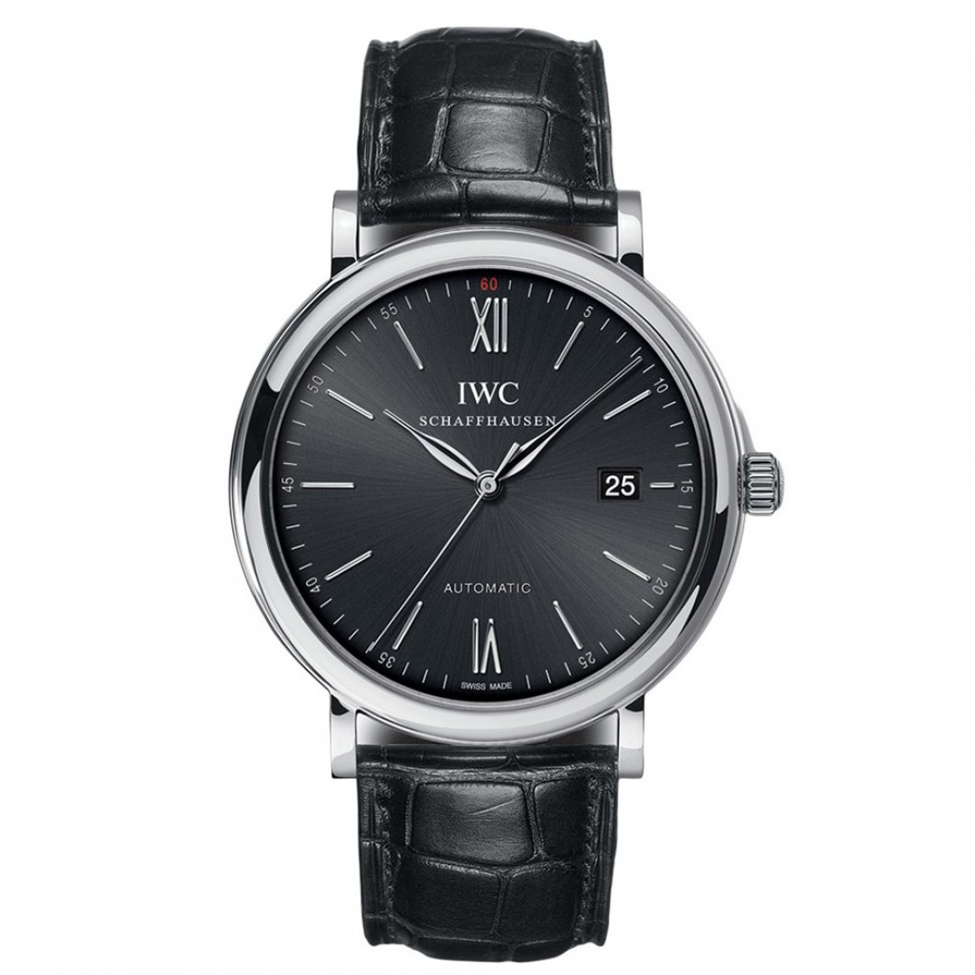 luxusné hodinky IWC Portofino AUTOMATIC Automat, 40 mm. Hodinky disponujú funkciami ukazovateľ dátumu. Základné parametre hodín sú: farba ciferníka je čierna, typ strojčeka je mechanické hodinky s automatickým náťahom, materiál remienka je koža a vode odolnosť je 30 m.