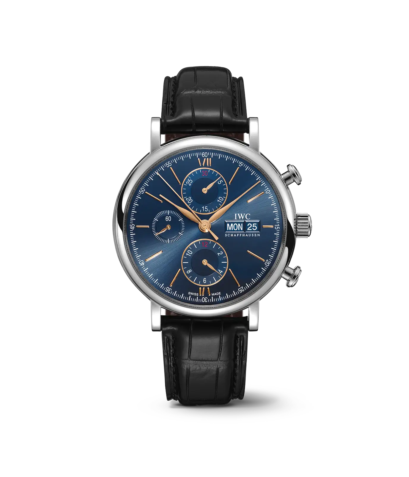 Luxusné hodinky IWC Portofino CHRONOGRAPH 42 mm. Hodinky disponujú funkciami stopky, ukazovateľ dátumu a Day-Date. Základné parametre hodín sú: typ strojčeka je mechanický chronograf s automatickým náťahom, materiál remienka je koža, vode odolnosť je 30 m a farba ciferníka je modrá.