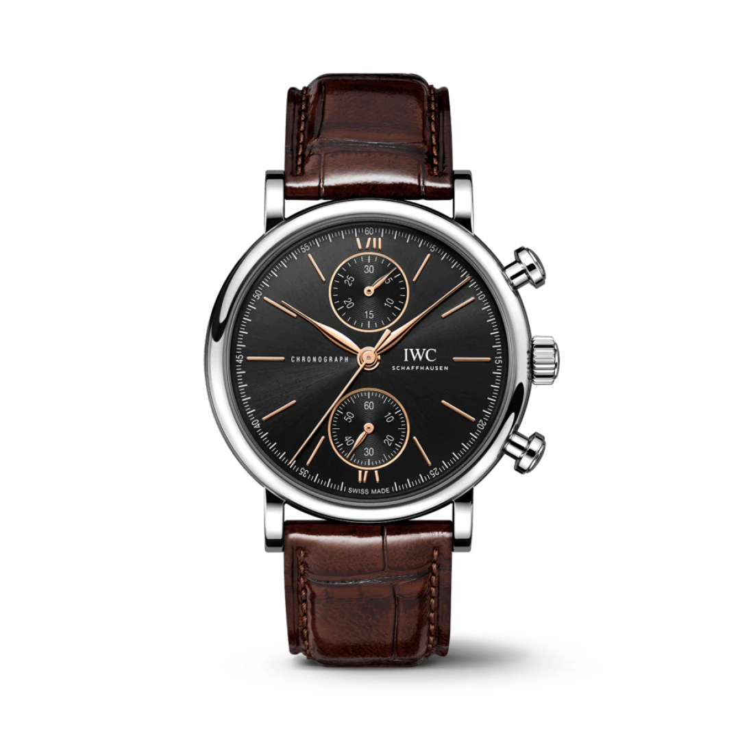 luxusné hodinky IWC Portofino CHRONOGRAPH Automat Chronograf, 39 mm. Hodinky disponujú funkciami stopky. Základné parametre hodín sú: typ strojčeka je mechanický chronograf s automatickým náťahom, materiál remienka je koža, vode odolnosť je 30 m a farba ciferníka je čierna.