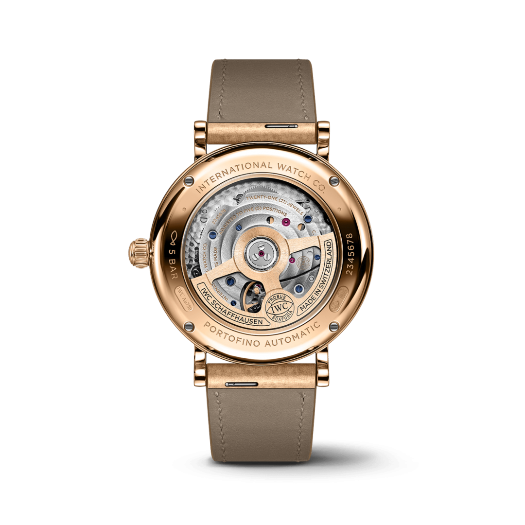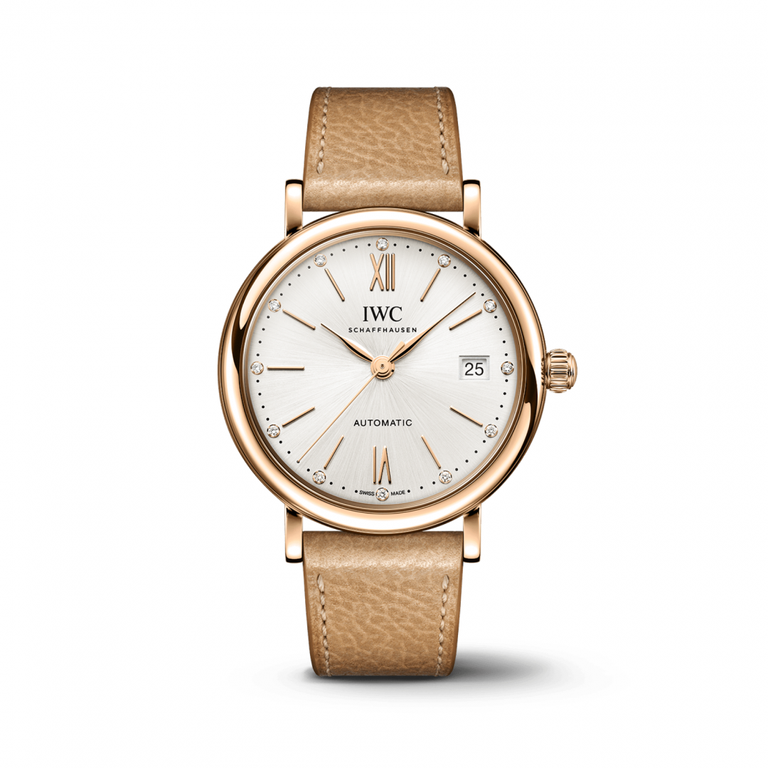 luxusné hodinky IWC Schaffhausen Portofino Zlato & Diamanty, Automat, 37 mm. Hodinky disponujú funkciami ukazovateľ dátumu. Základné parametre hodín sú: farba ciferníka je strieborná, typ strojčeka je mechanické hodinky s automatickým náťahom, materiál remienka je koža a vode odolnosť je 50 m.