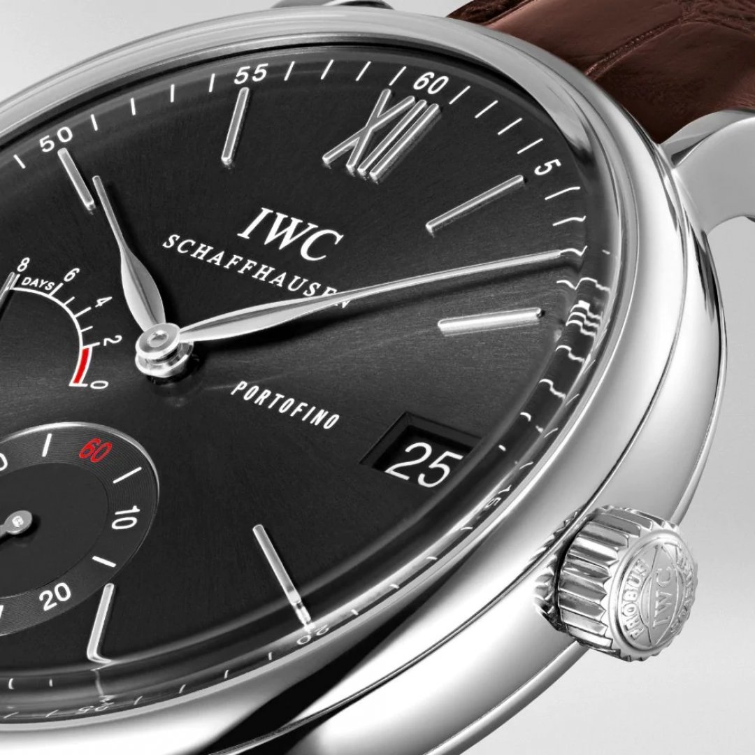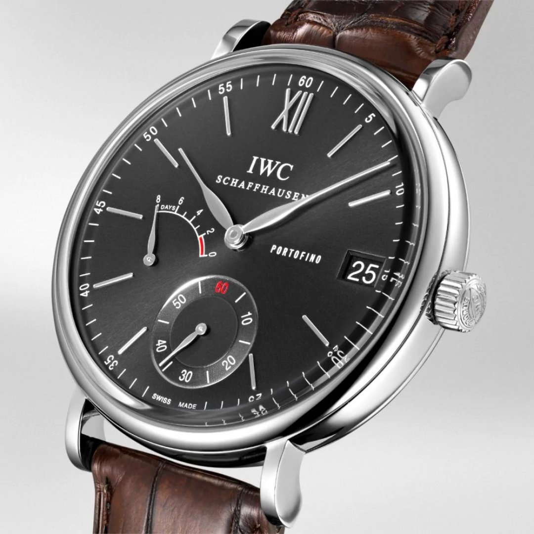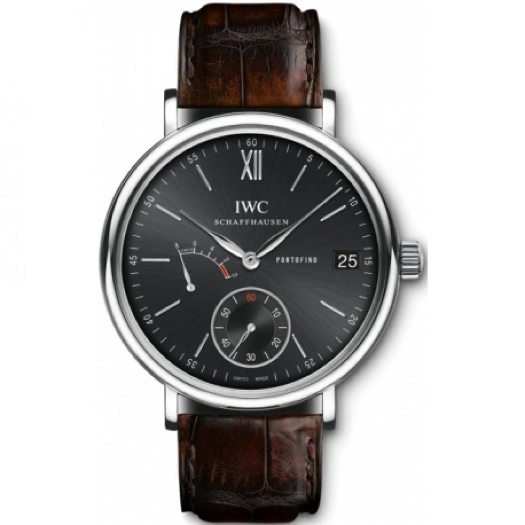 Luxusné hodinky IWC Portofino HAND-WOUND EIGHT DAYS Manufaktúrny kaliber, 45 mm. Hodinky disponujú funkciami ukazovateľ dátumu a rezerva chodu. Základné parametre hodín sú: farba ciferníka je čierna, typ strojčeka je mechanické hodinky s ručným náťahom, materiál remienka je koža a vode odolnosť je 30 m.