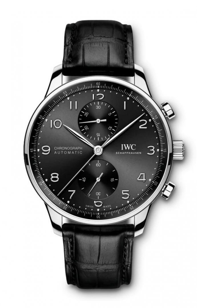 Luxusné hodinky IWC Portugieser CHRONOGRAPH Manufaktúrny kaliber, 41 mm. Hodinky disponujú funkciami stopky. Základné parametre hodín sú: typ strojčeka je mechanický chronograf s automatickým náťahom, materiál remienka je koža, vode odolnosť je 30 m a farba ciferníka je čierna.