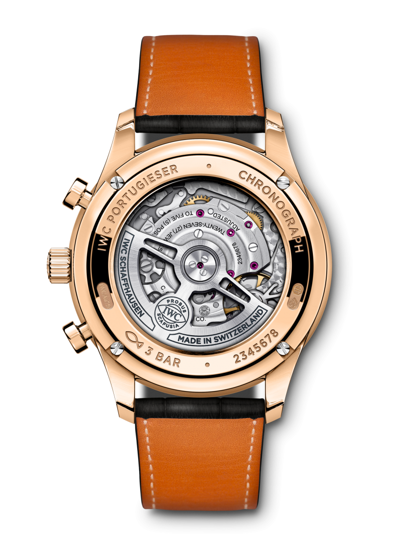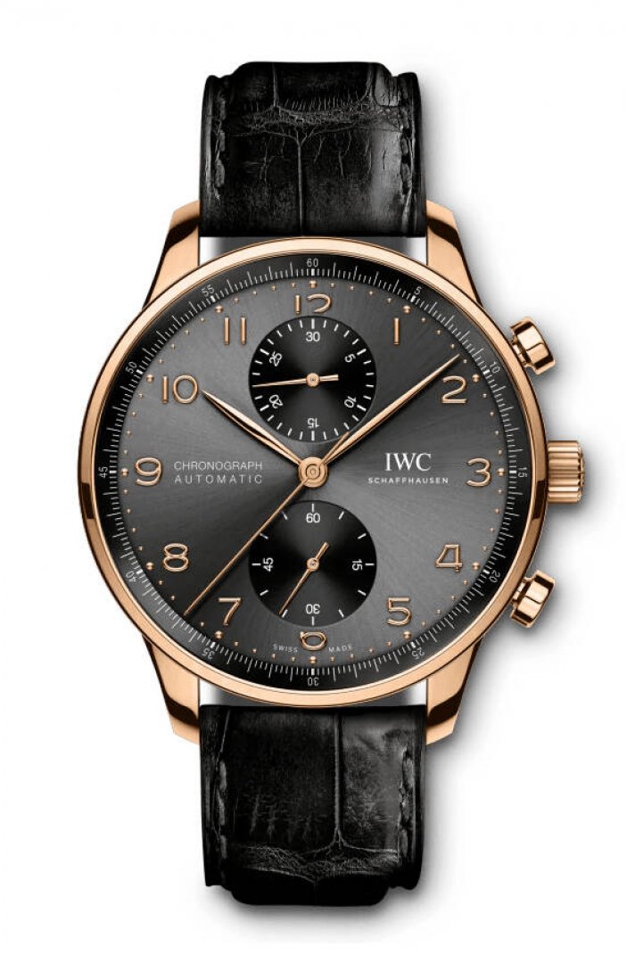 luxusné hodinky IWC Schaffhausen Portugieser CHRONOGRAPH Manufaktúrny kaliber, 41 mm. Hodinky disponujú funkciami stopky. Základné parametre hodín sú: typ strojčeka je mechanický chronograf s automatickým náťahom, materiál remienka je koža, vode odolnosť je 30 m a farba ciferníka je šedá.