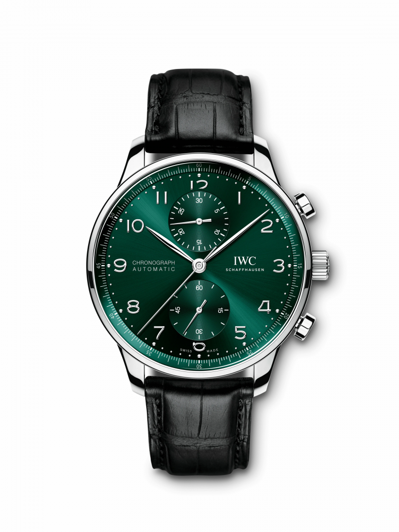 švajčiarske hodinky IWC Portugieser Chronograph Manufaktúrny kaliber, 41 mm. Hodinky disponujú funkciami stopky. Základné parametre hodín sú: farba ciferníka je zelená, typ strojčeka je mechanický chronograf s automatickým náťahom, materiál remienka je koža a vode odolnosť je 30 m.