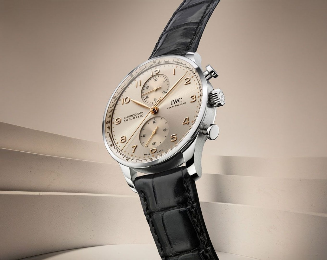 luxusné hodinky IWC Schaffhausen Portugieser CHRONOGRAPH Dune, 41 mm. Hodinky disponujú funkciami stopky. Základné parametre hodín sú: typ strojčeka je mechanický chronograf s automatickým náťahom, materiál remienka je koža, vode odolnosť je 30 m a farba ciferníka je zlatá.
