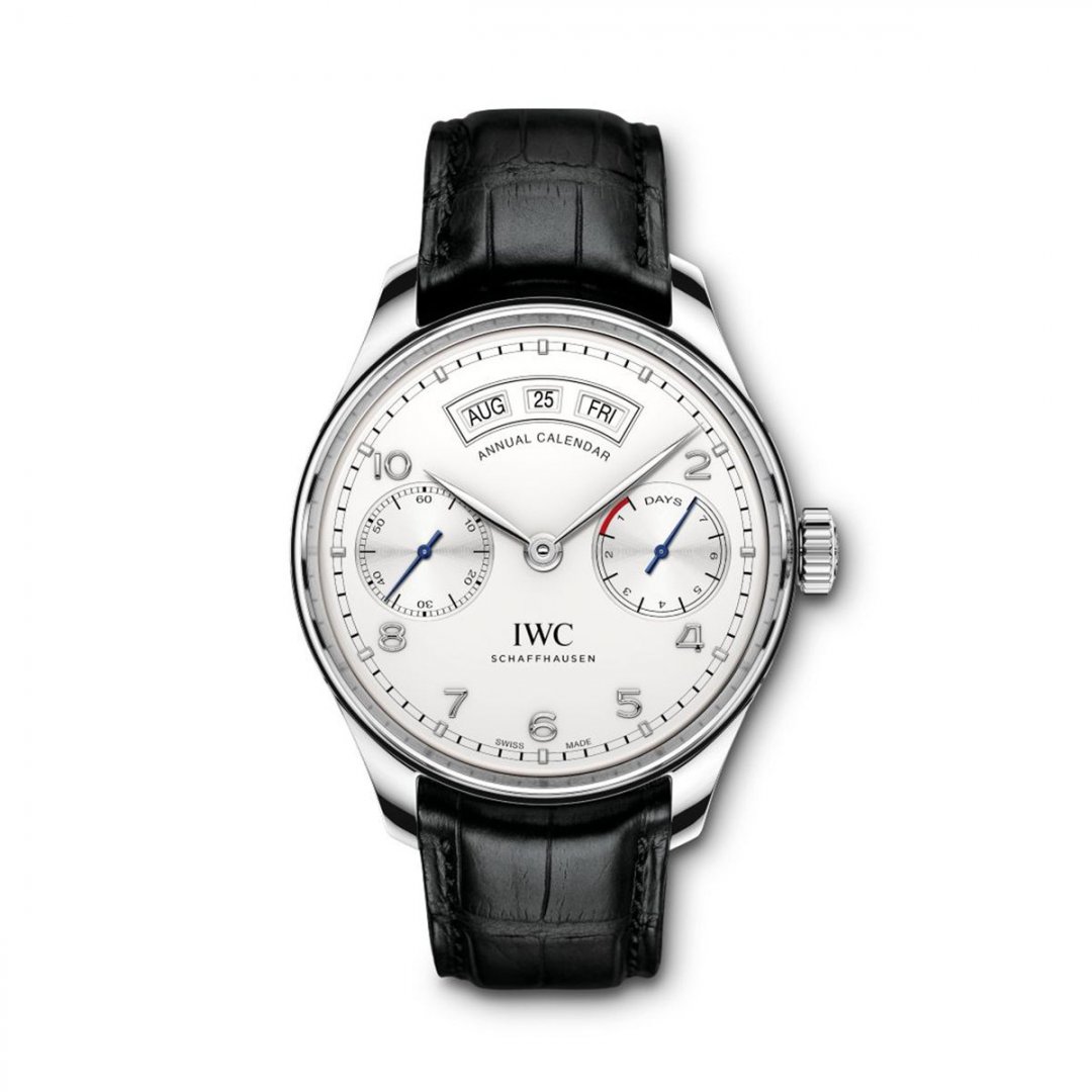 Luxusné hodinky IWC Portugieser ANNUAL CALENDAR Ročný kalendár, 44.2 mm. Hodinky disponujú funkciami ukazovateľ dátumu, rezerva chodu a ročný kalendár. Základné parametre hodín sú: typ strojčeka je mechanické hodinky s automatickým náťahom, materiál remienka je koža, vode odolnosť je 30 m a farba ciferníka je strieborná.