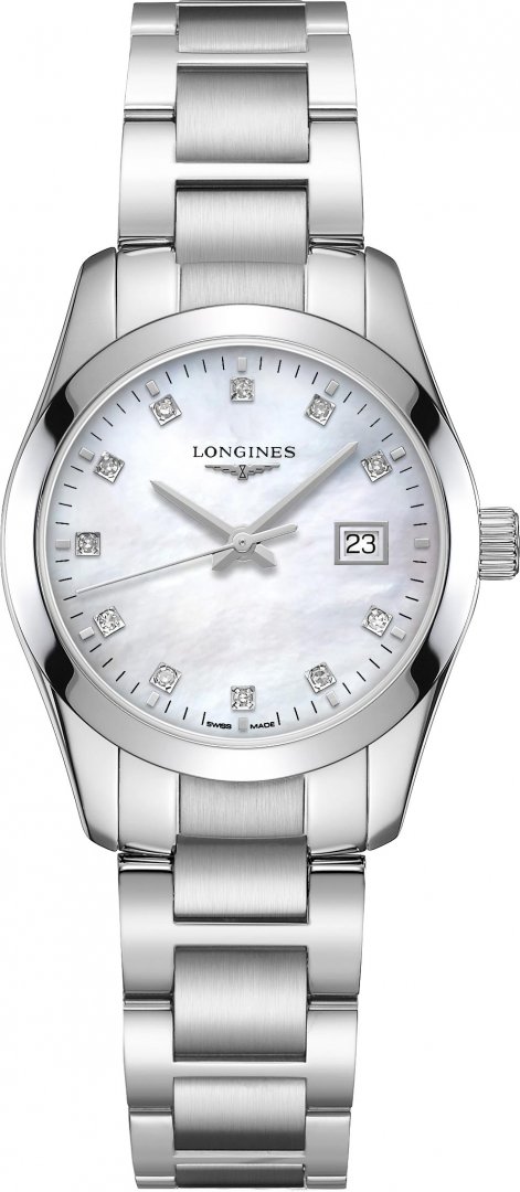 Luxusné hodinky Longines Conquest Classic Diamanty, Quartz, 29.50 mm. Hodinky disponujú funkciami luminiscencia a E.O.L.. Základné parametre hodín sú: farba ciferníka je perleť, typ strojčeka je Quartz hodinky, materiál remienka je oceľ a vode odolnosť je 50 m.