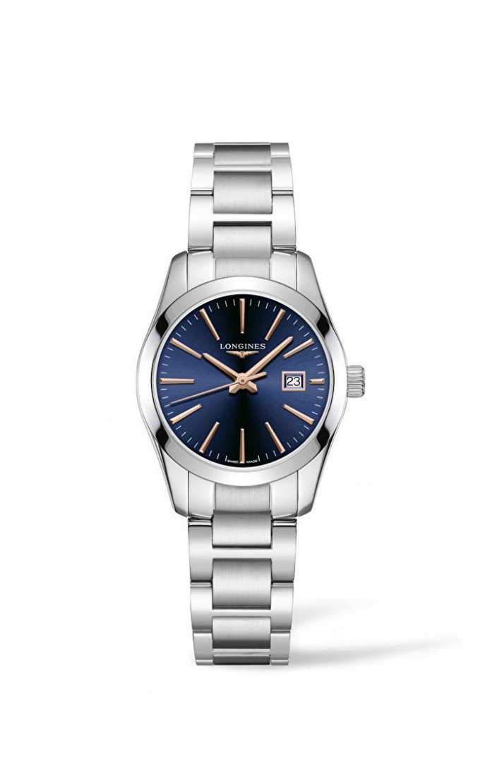 Luxusné hodinky Longines Conquest Classic Quartz, 29.50 mm. Hodinky disponujú funkciami luminiscencia, ukazovateľ dátumu a E.O.L.. Základné parametre hodín sú: typ strojčeka je Quartz hodinky, materiál remienka je oceľ, vode odolnosť je 50 m a farba ciferníka je modrá.